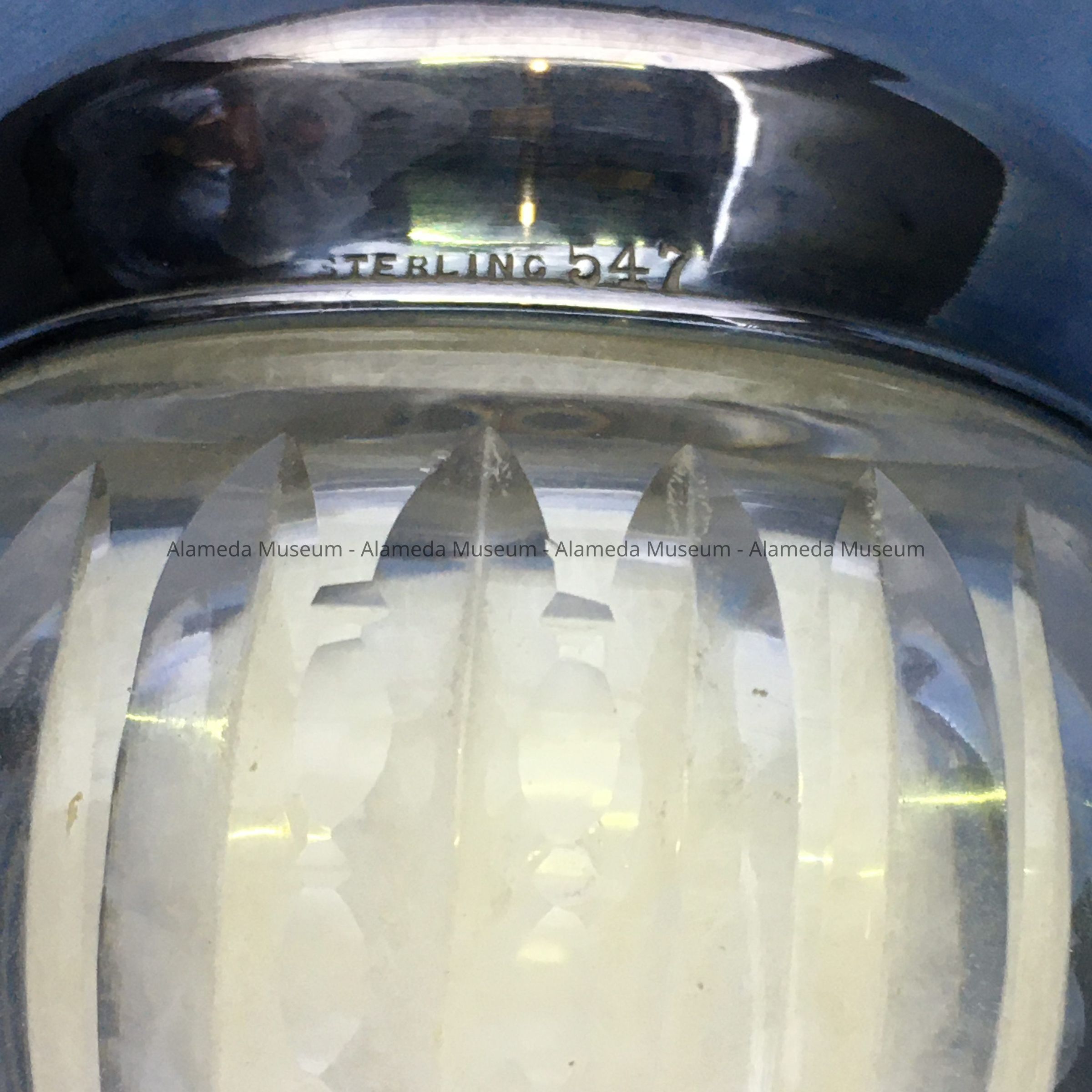 Description: Cut crystal (zipper pattern) powder jar, sterling silver lid (numbered 547) with raised cupid motif & repossee flowers. Jar contains original feather powder puff with silver handle.