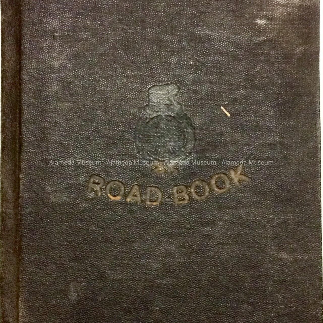 HARD-BOUND BOOKLET, WITH COVER OF BLACK-COLORED BUCKRAM. INCISED CAPTION, "ROAD BOOK," APPEARS IN FADED GOLD COLOR.