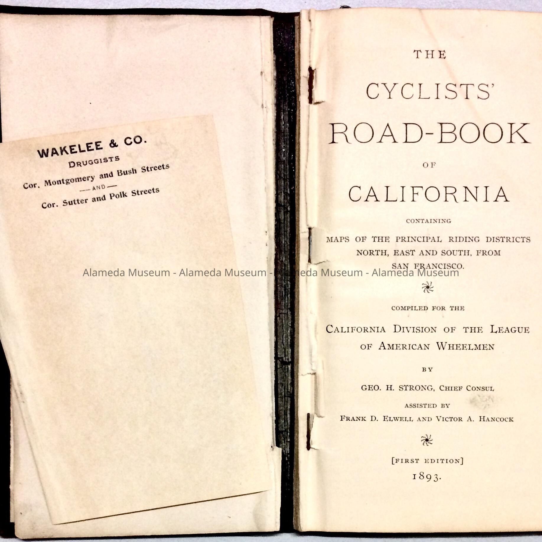 BOOK ENTITLED, "THE CYCLIST'S ROAD-BOOK OF CALIFORNIA," CONTAINING MAPS OF THE PRINCIPAL RIDING DISTRICTS --- NORTH, EAST, AND SOUTH OF SAN FRANCISCO. PUBLISHED IN 1893. BOOK IS INSCRIBED, "DR E P S CLARK, ALAMEDA, CAL, 2161 CENTRAL AVENUE." OBJECT WAS GIVEN TO THE ALAMEDA HISTORICAL SOCIETY PRIOR TO 1971, NUMBERED "179-X," BUT HERETOFORE NOT OFFICIALLY CATALOGED.