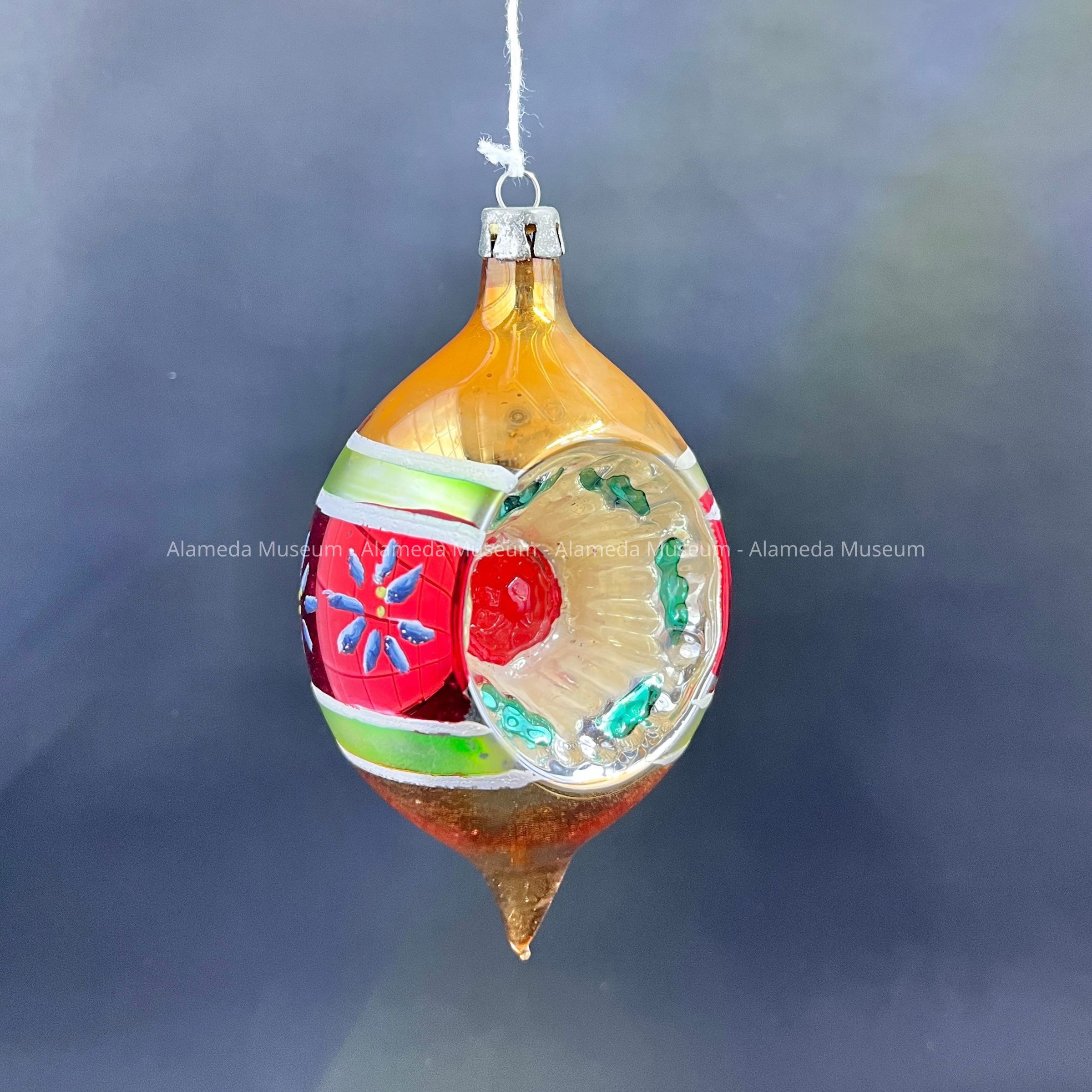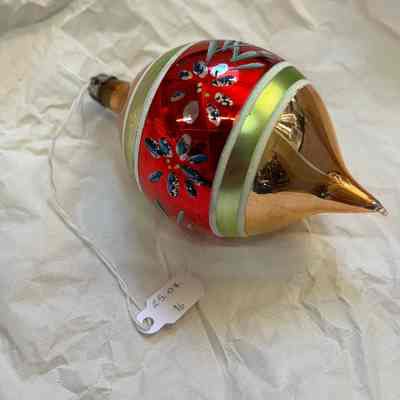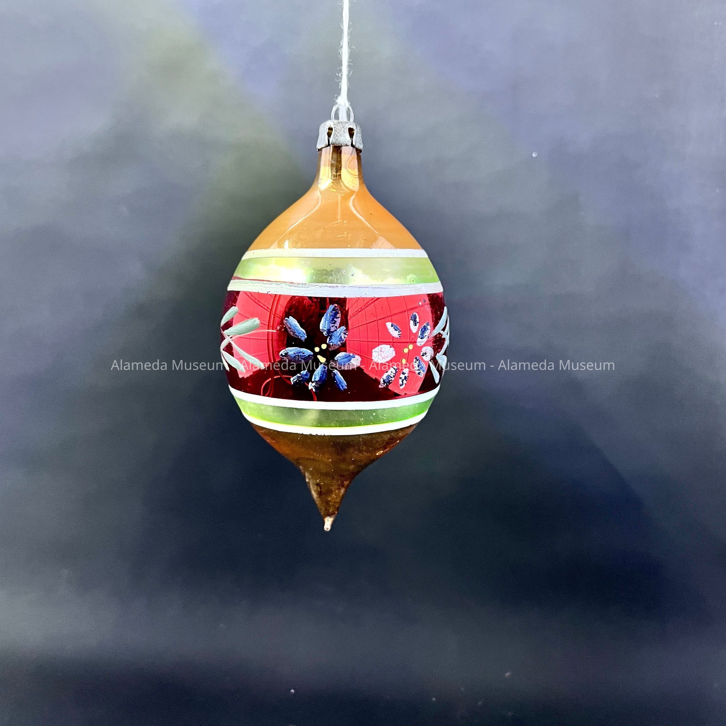Description: Made possibly during the Interwar Period, this ornament may be apart of the Shiny Brites company. Having multiple colors as the base, the paint has blue flowers and green leaves.