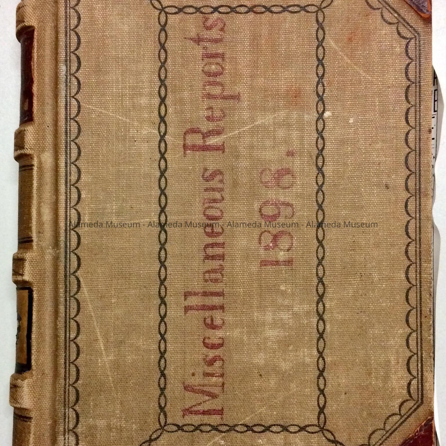 A HARD-BOUND LEDGER, COVER OF WHICH IS GREY-COLORED BUCKRAM WITH A DECORATIVE DESIGN IN BLACK-COLORED TYPE. LEDGER IS TRIMMED IN IMITATION BURGUNDY-COLORED LEATHER. CAPTION ON COVER IS IN BLUE-COLORED INK AND STATES, "MISCELLANEOUS REPORTS, 1898."