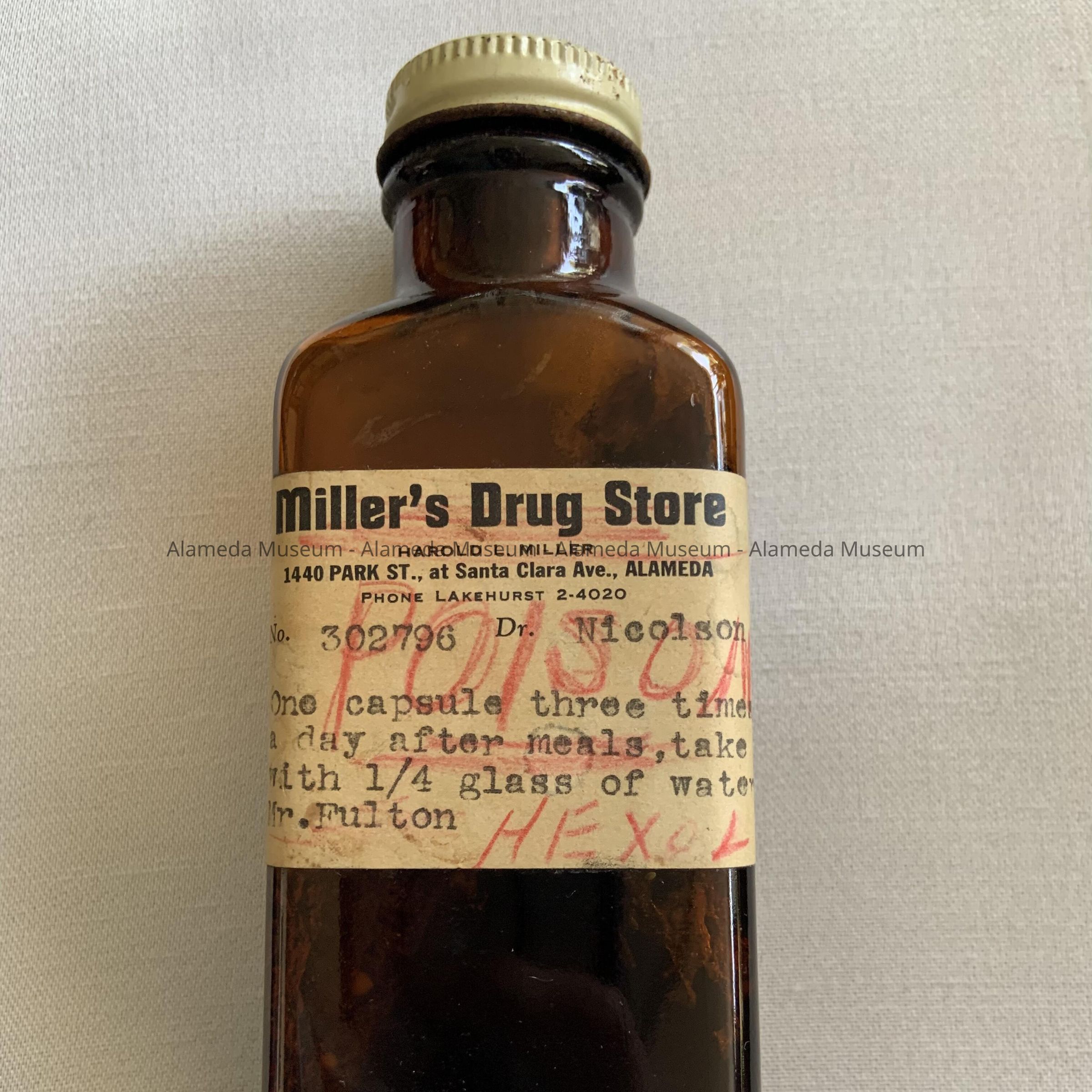 HISTORY OF OBJECT: MEDICATION PRESCRIBED BY DR NICOLSON AND PURCHASED AT MILLER'S DRUG STORE, 1440 PARK STREET @ SANTA CLARA AVENUE, ALAMEDA, CA.