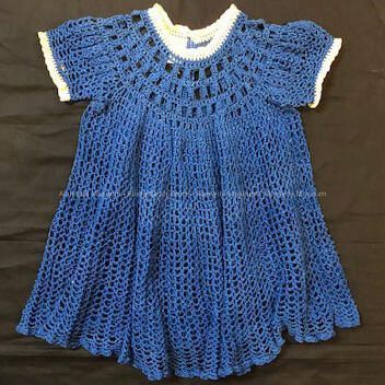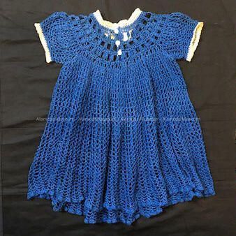 A ONE-PIECE DRESS, CROCHETED, DARK BLUE-COLORED YARN. NECKLINE AND SLEEVES ARE TRIMMED IN WHITE. FOUR WHITE-COLORED PEARL BUTTONS ADORN THE BACK OF THE GARMENT.