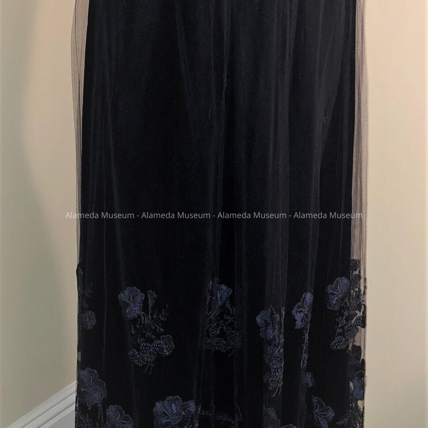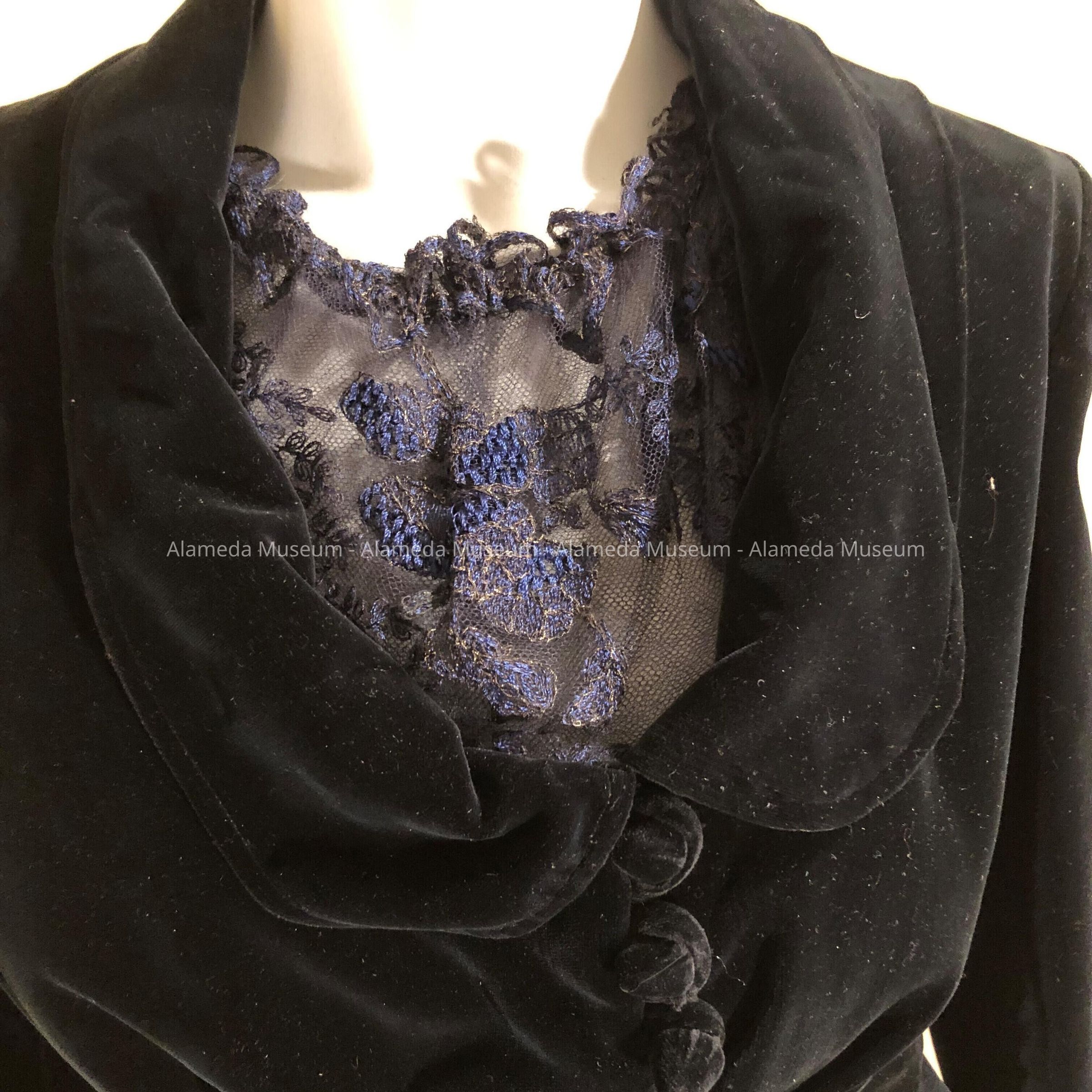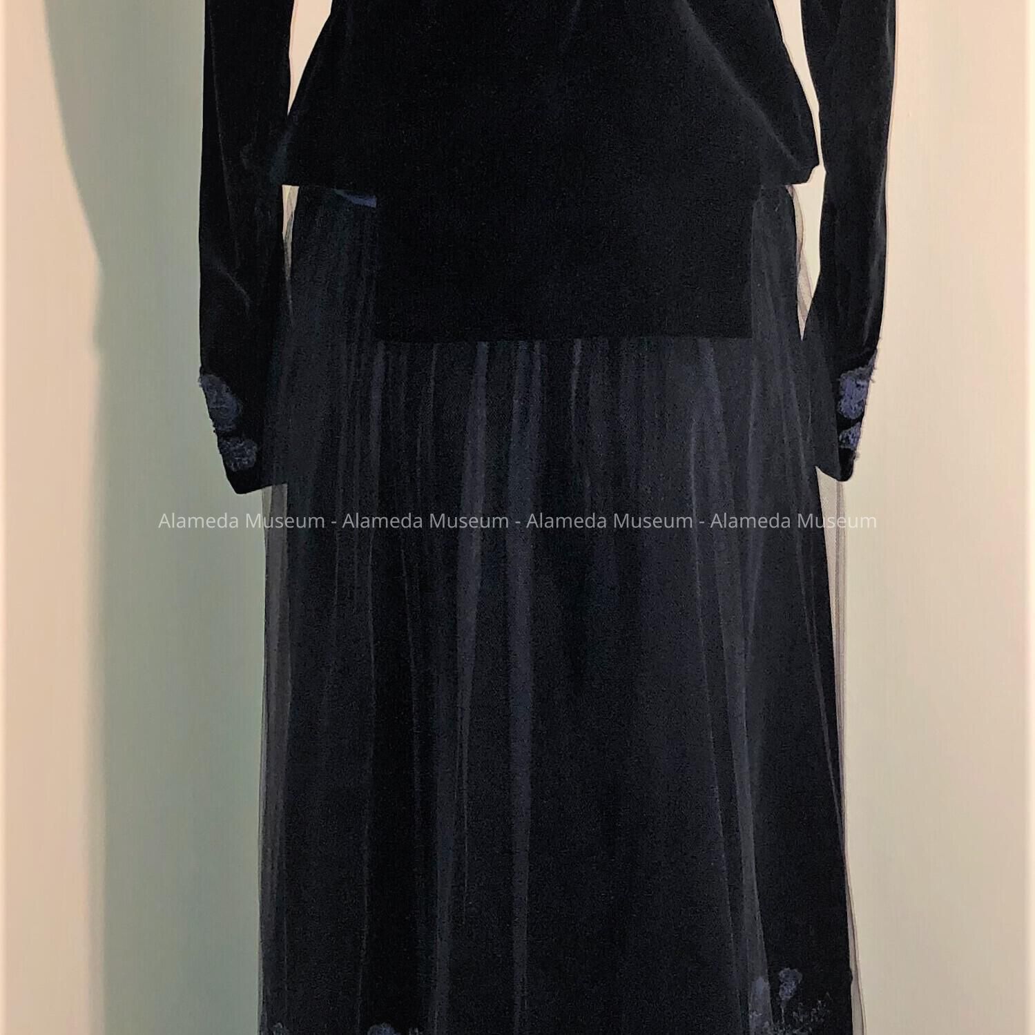 Dark blue velvet 2 piece suit with embroidered netting over skirt and repeated at bodice. Silk label states " Imported by Livingtons Brothers, S.F."
