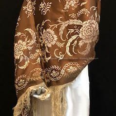 Silk shawl with woven design of light brown colored flowers on a dark brown colored background. Hand tied applied silk fringe entire edge of shawl.