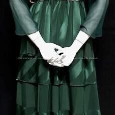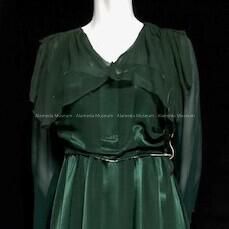 Description: Dark green colored striped satin dress trimmed in georgette.