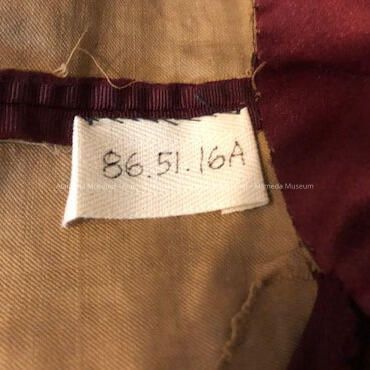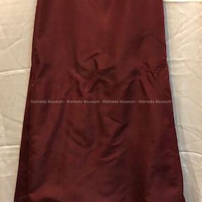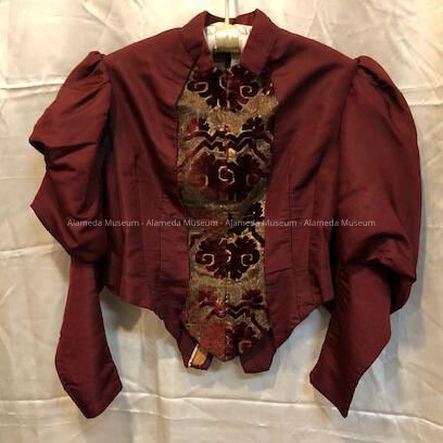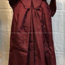 Description: Day dress (2 piece) of maroon colored silk faille. Bodice has a high neck (mandarin) with cut velvet/brocade inset down the center. Leg of mutton sleeves narrowing to tight wrists. Bodice has pointed front.