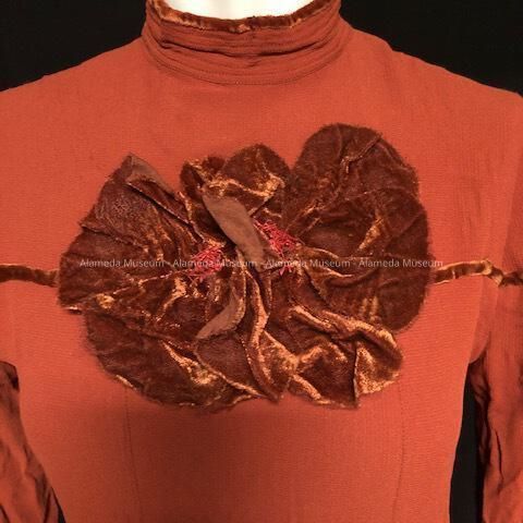 DAY DRESS OF RUST-COLORED CREPE. TRIMMED AT NECK AND BODICE IN RUST-COLORED SILK VELVET. BODICE HAS TWO ATTACHED FLOWERS IN SILK VELVET. BELT IS MISSING; AND THERE IS NO DRESS LABEL ATTACHED.