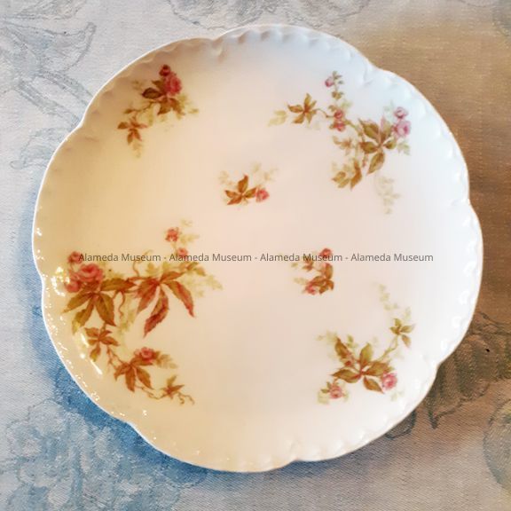 Description: Porcelain luncheon plate signed Haviland, France, with transfer design depicting pink roses and green leaves.