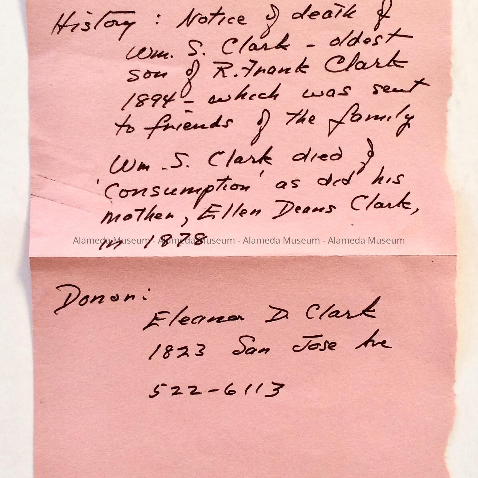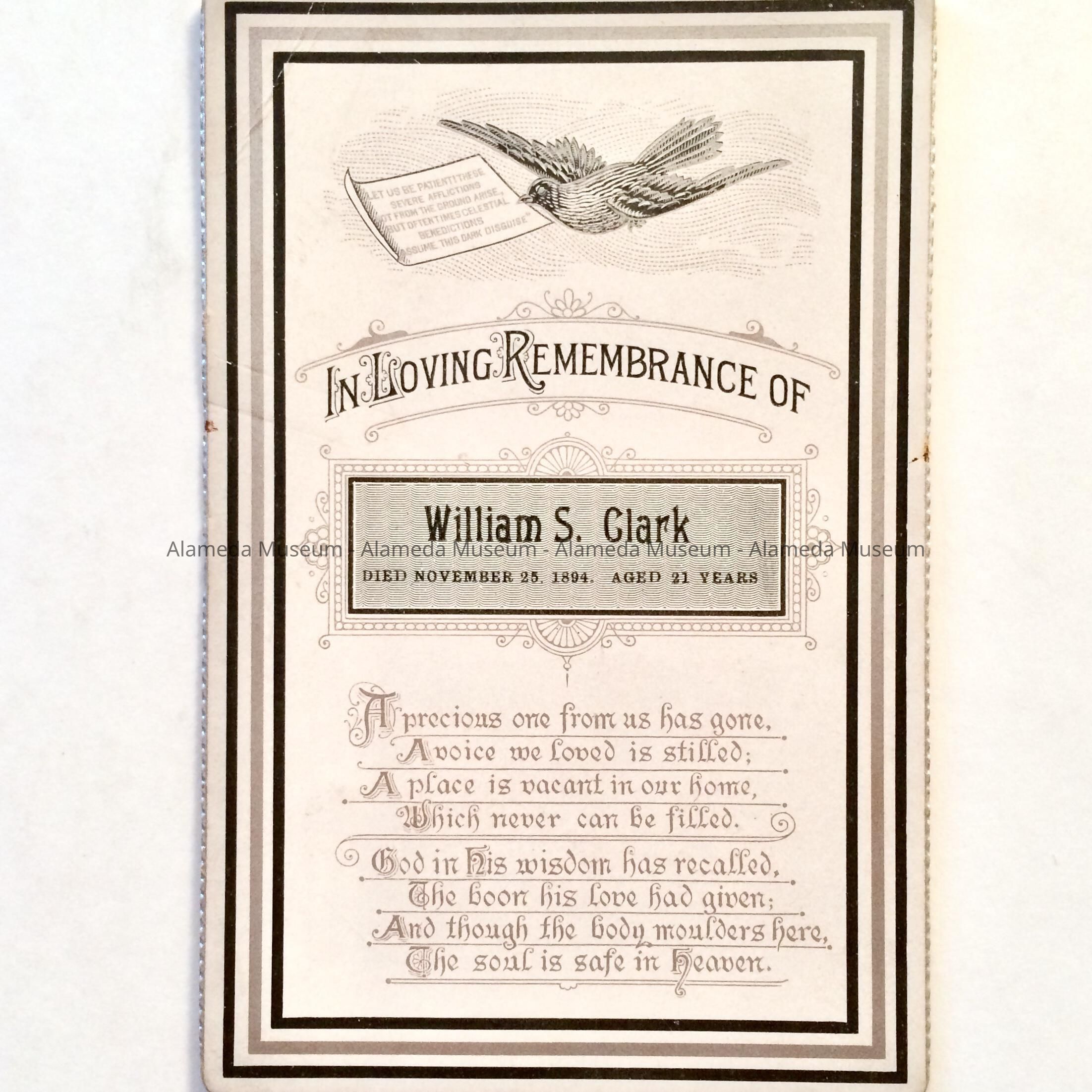 History of Object: Notice of death of William S. Clark, who was the oldest son of R. Frank Clark, in 1894, which was sent to friends of the family. William S. Clark died of 'consumption' as did his mother, Ellen Deans Clark, in 1878.