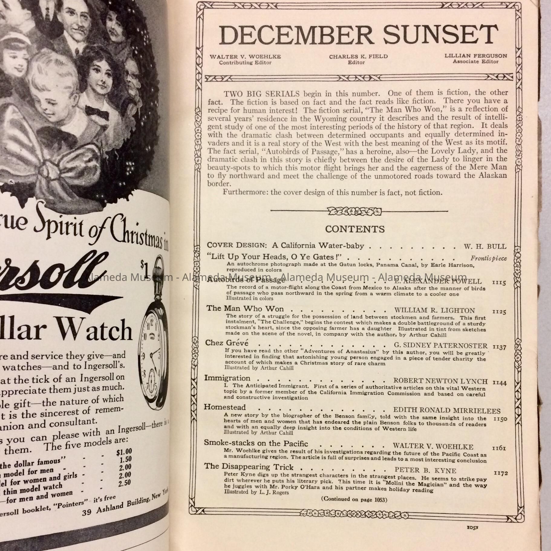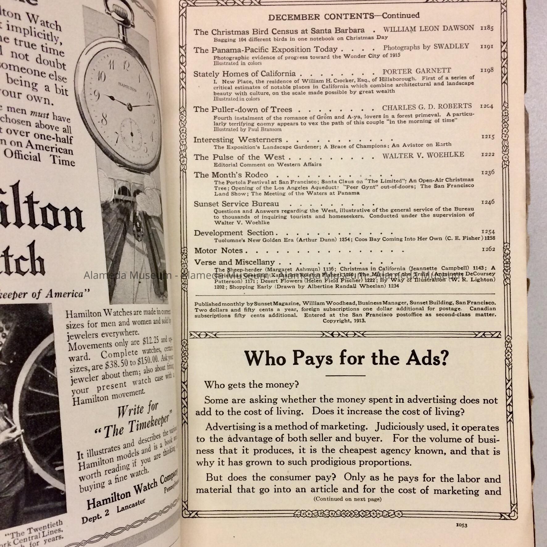 DECEMBER 1913 ISSUE OF "SUNSET" MAGAZINE THAT BELONGED TO THE JUDGE DANIEL H KNOX FAMILY. MR KNOX WAS THE STEPFATHER OF THE DONOR. DANIEL KNOX SERVED AS A POLICE JUDGE FOR THE CITY OF ALAMEDA. THE FAMILY CAME TO ALAMEDA IN THE LATE 1890's.