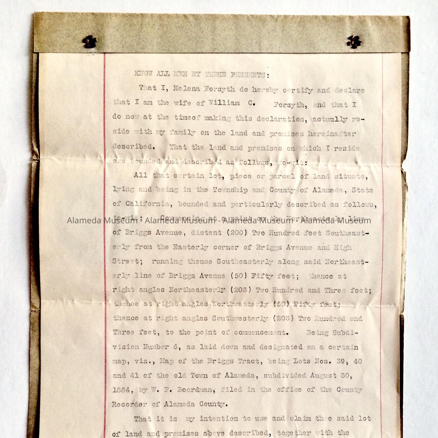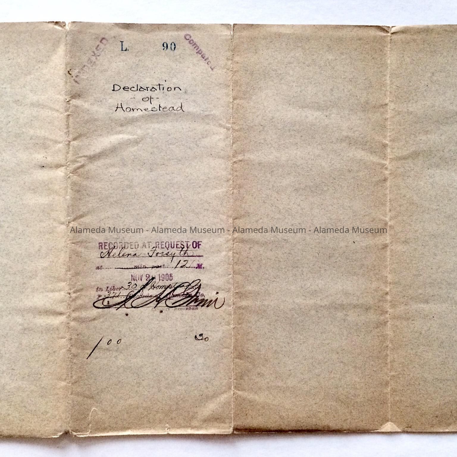 HISTORY OF OBJECT: A DECLARATION OF HOMESTEAD RECORDING THE REQUEST OF HELENA FORSYTH, DATED NOVEMBER 20, 1905 FOR THE PROPERTY 3219 BRIGGS AVENUE, ALAMEDA.