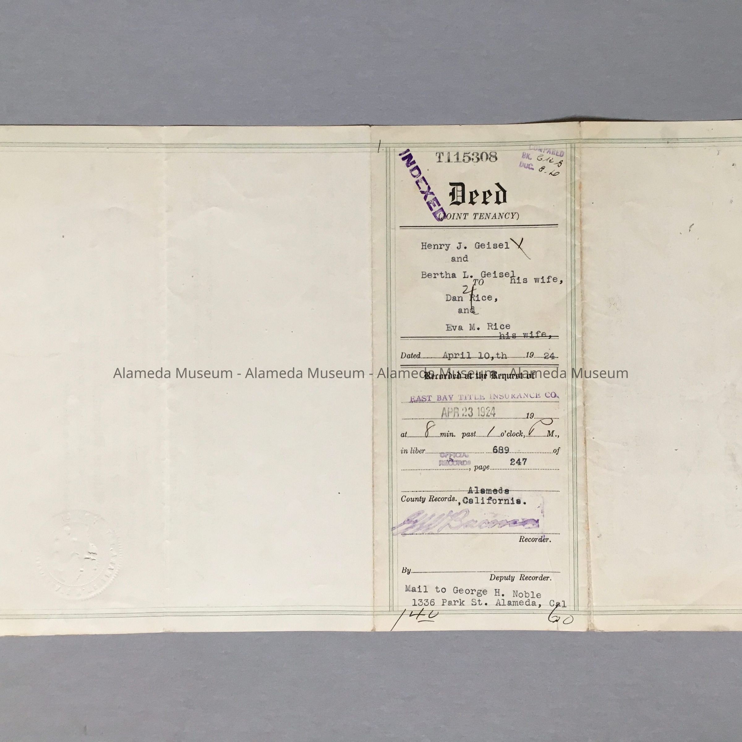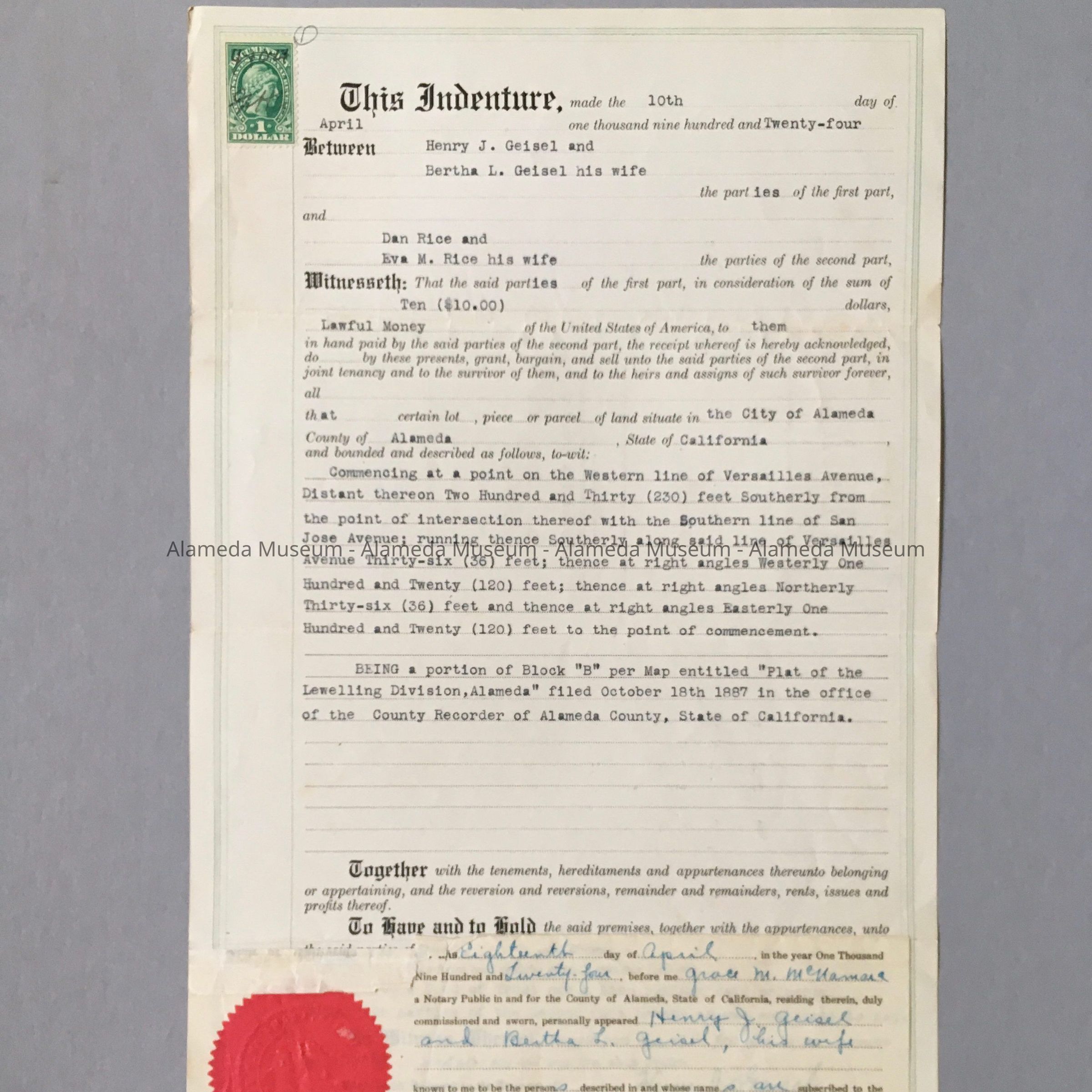 History of Object: Deed (Joint Tenancy), inscribed Henry J. Geisel & Bertha L. Geisel (his wife), to Dan & Eva M. Rice, dated April 10, 1924. Deed to the property known as 1121 Versailles Avenue, Alameda.