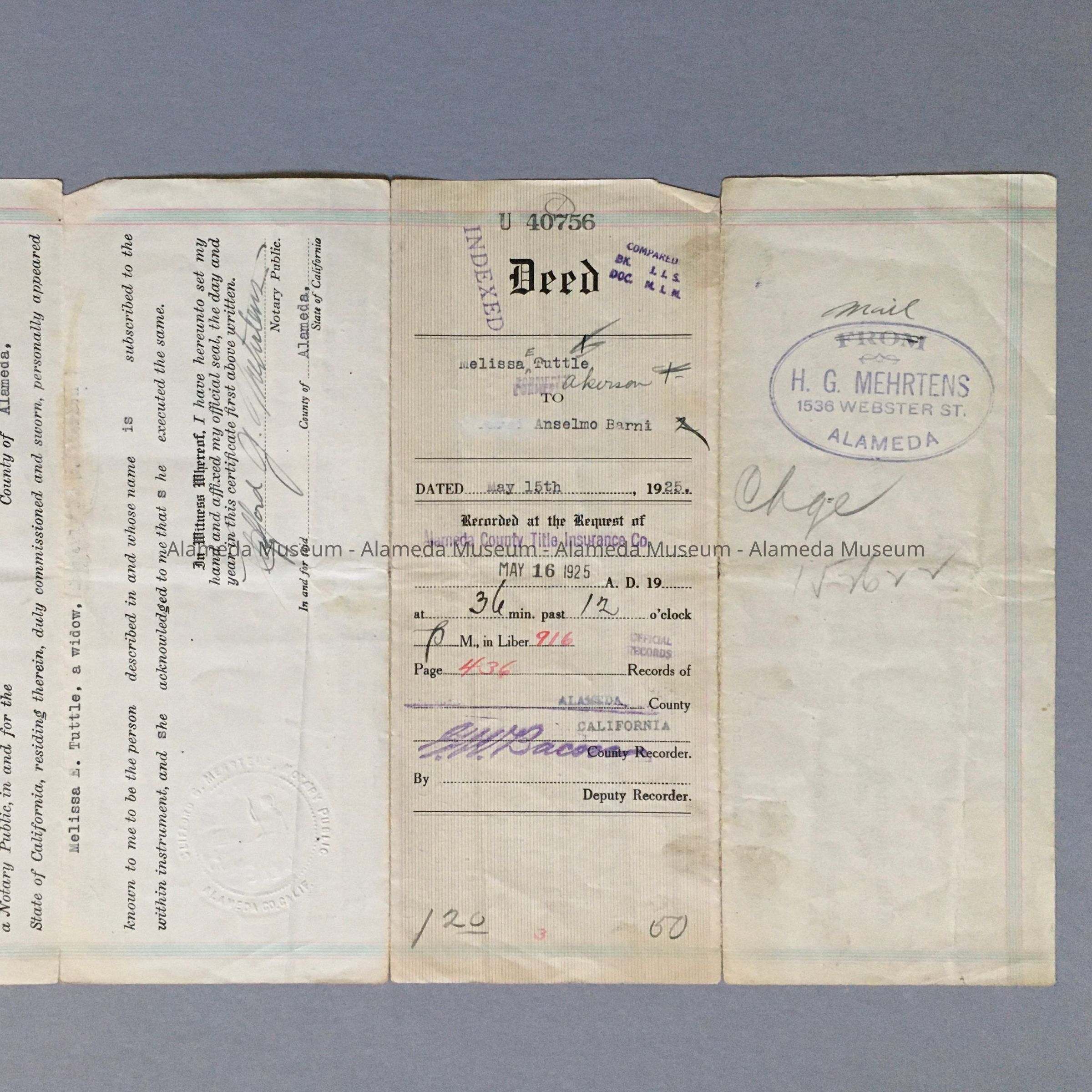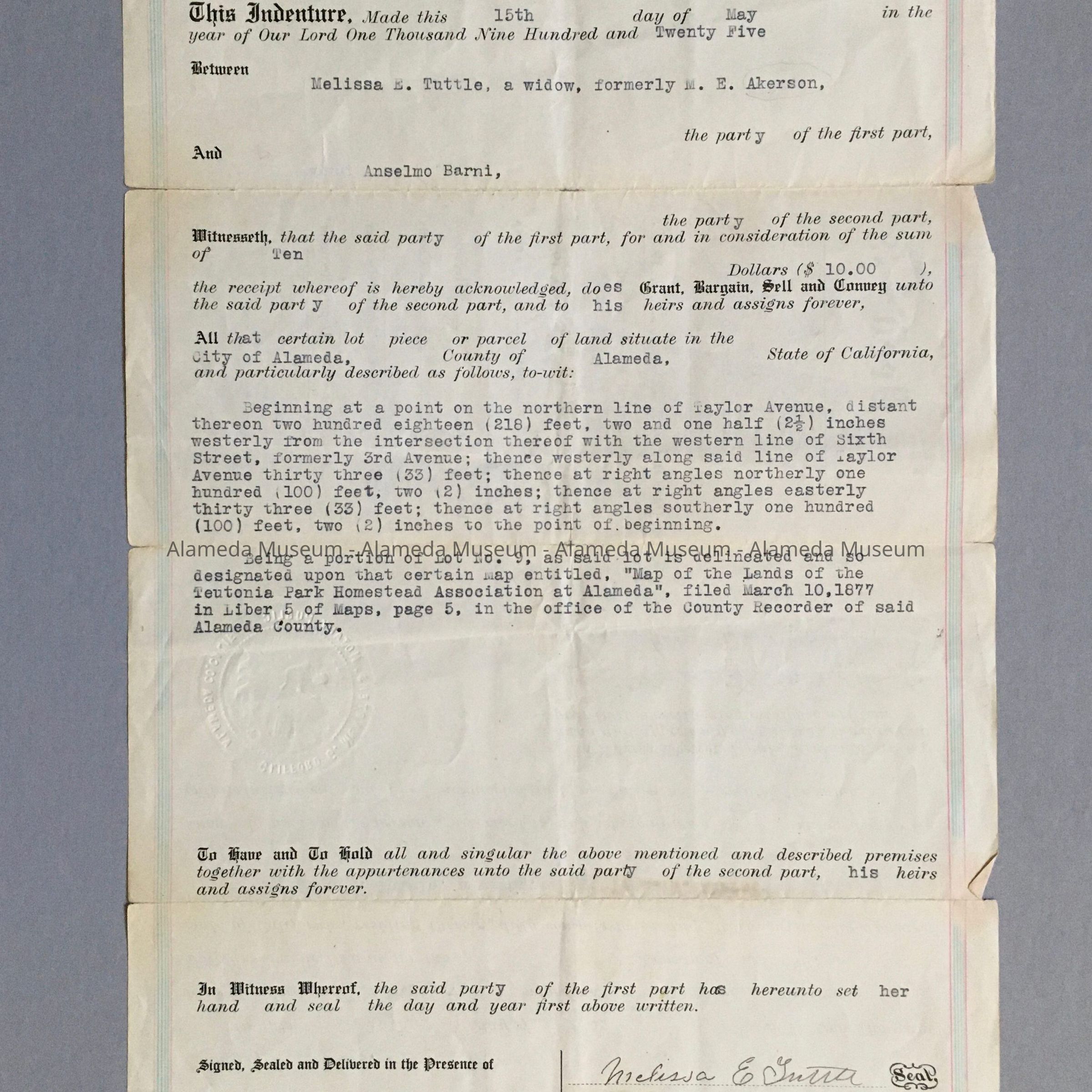 History of Object: Deed to 545 Taylor Avenue, Alameda, from Melissa Tuttle to Anselmo Barni, dated May 15, 1925.