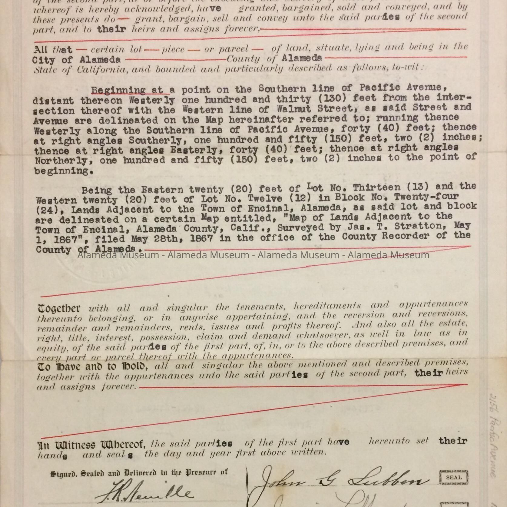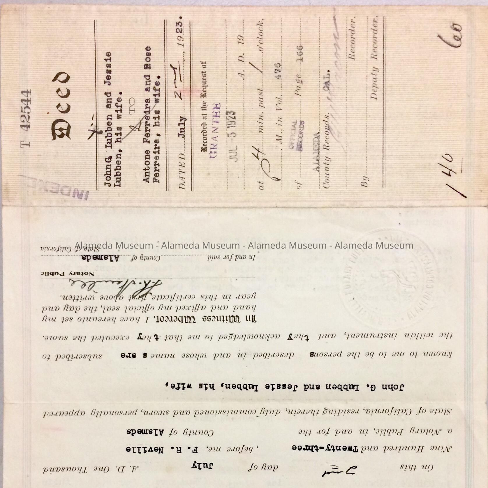 History of Object: Deed dated July 2, 1923, for property known as 2156 Pacific Avenue. This deed was recorded from John G. Lubber and Jessie Lubber, his wife to Antone Ferreira and Rose Ferreira, his wife. John G. Lubber ran a wood, coal, hay and grain supply business, plus a livery stable, located at 1701 Webster Street.