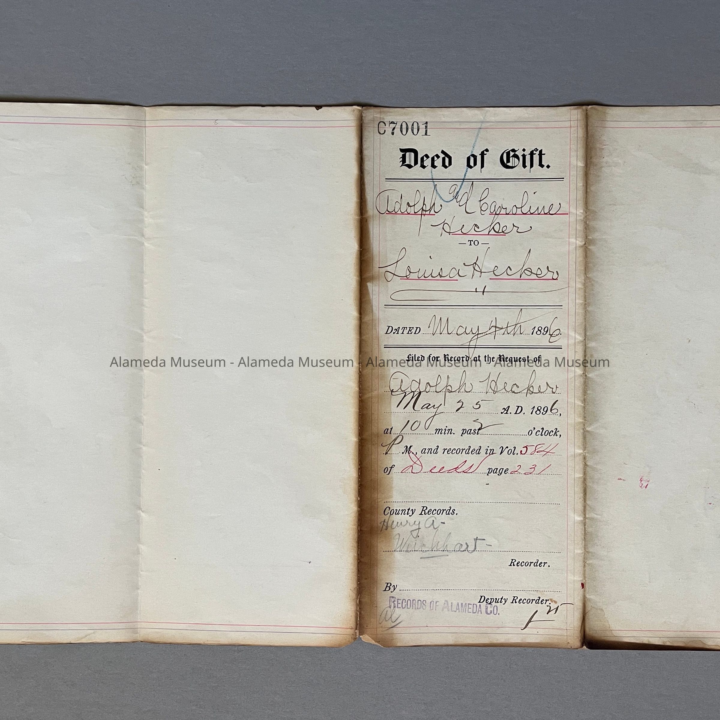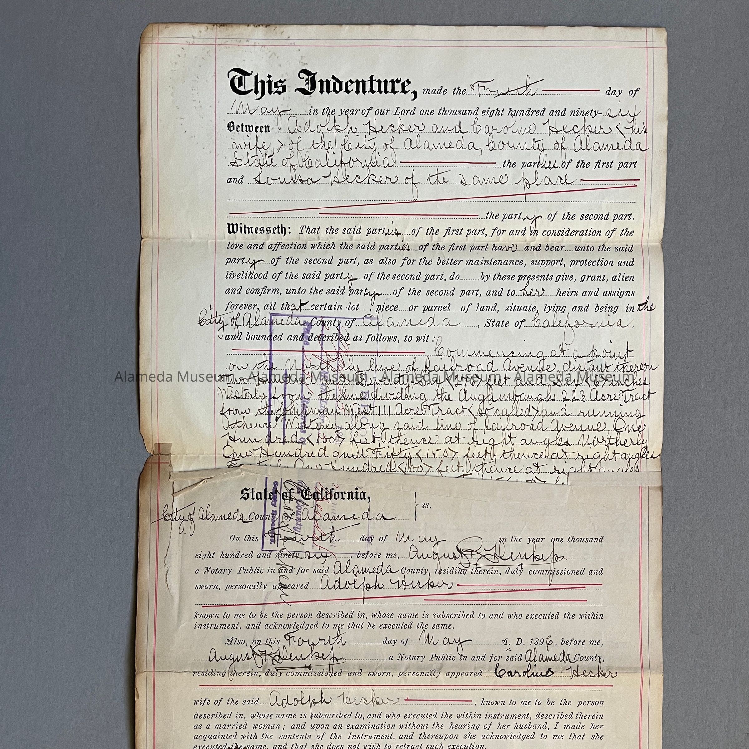 A DEED FOR PROPERTY AT 543, 545, AND 547 LINCOLN AVENUE. THE DEED IS GIVING PROPERTY TO LOUISE HECKER, DAUGHTER OF ADOLPH AND CAROLINE HECKER. LOUISE LATER MARRIED HENRY A WEICHART. THEY HAD A HOME BUILT FOR THEMSELVES IN 1896.