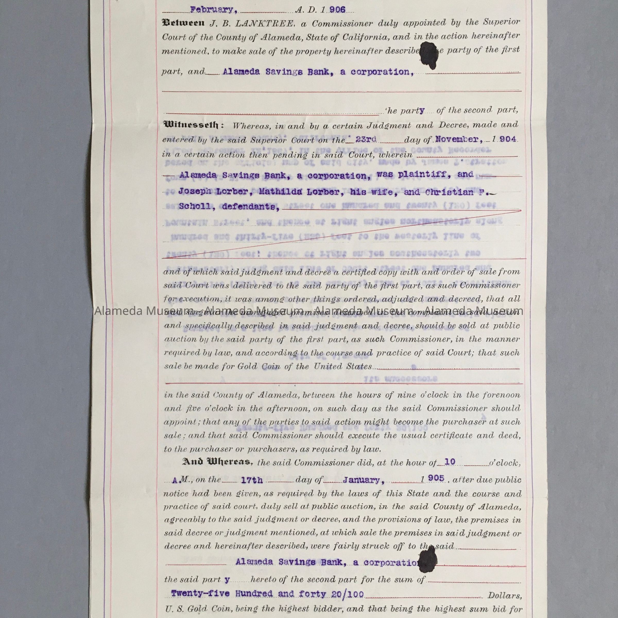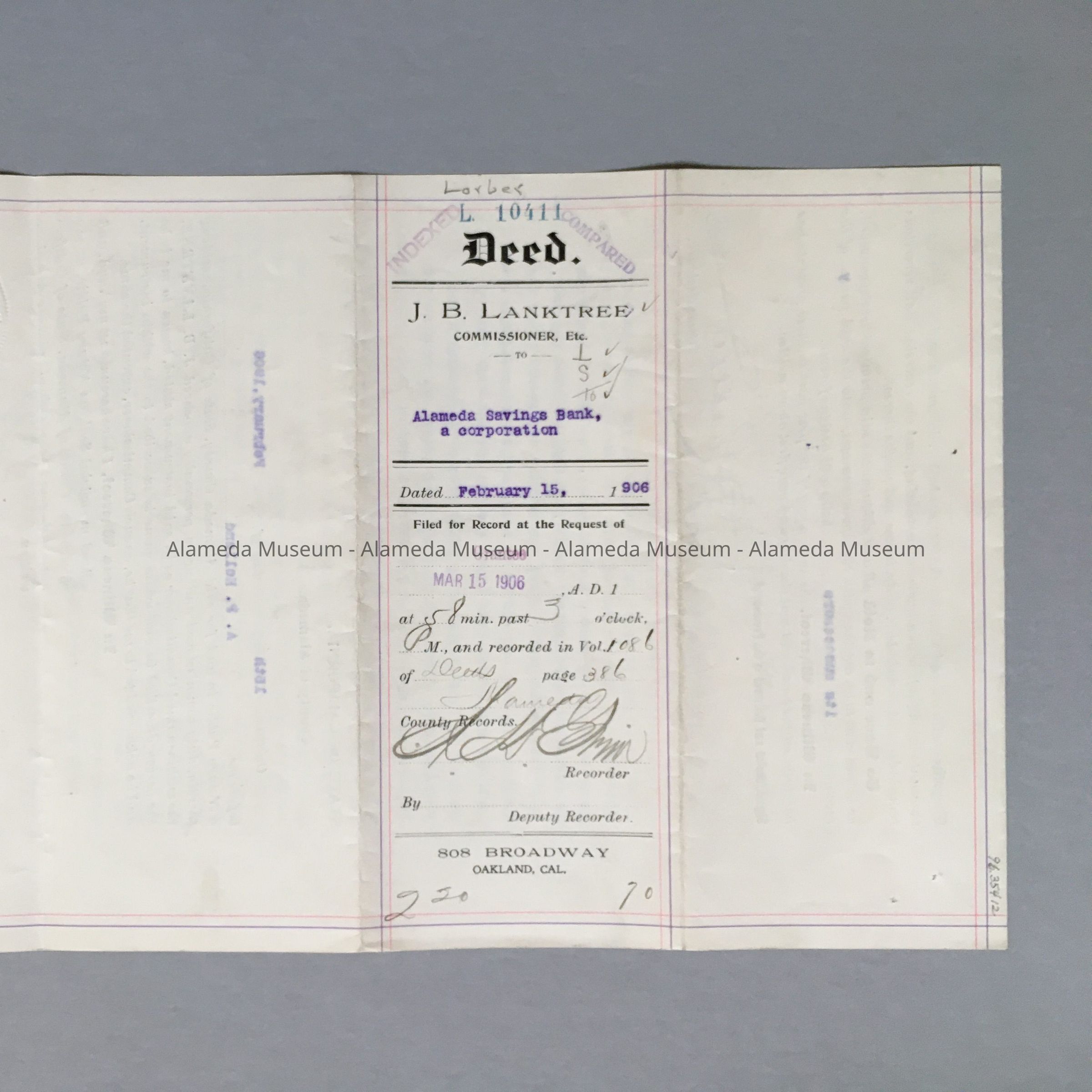 DEED BETWEEN J B LANKTREE AND. THE ALAMEDA SAVINGS BANK, FOR PROPERTY AT VAN BUREN AND FOUNTAIN STREETS, EAST END, ALAMEDA, CALIFORNIA.
