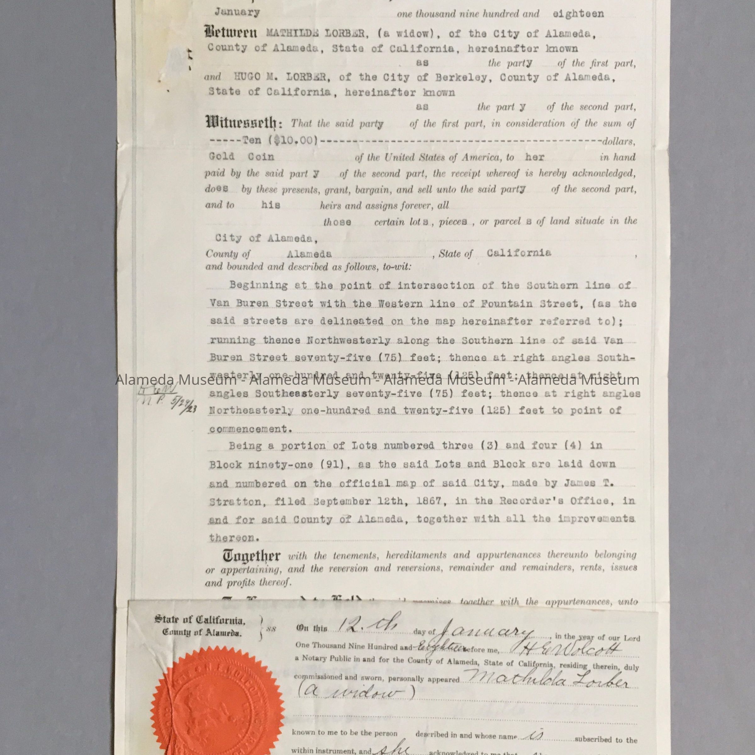 DEED BETWEEN MATHILDA LORBER TO HUGO M LORBER, DATED NOVEMBER 11, 1918, FOR PROPERTY AT VAN BUREN AND FOUNTAIN STREETS, ALAMEDA, CALIFORNIA, BEING A PORTION OF LOTS #3 AND #4 IN BLOCK #91.