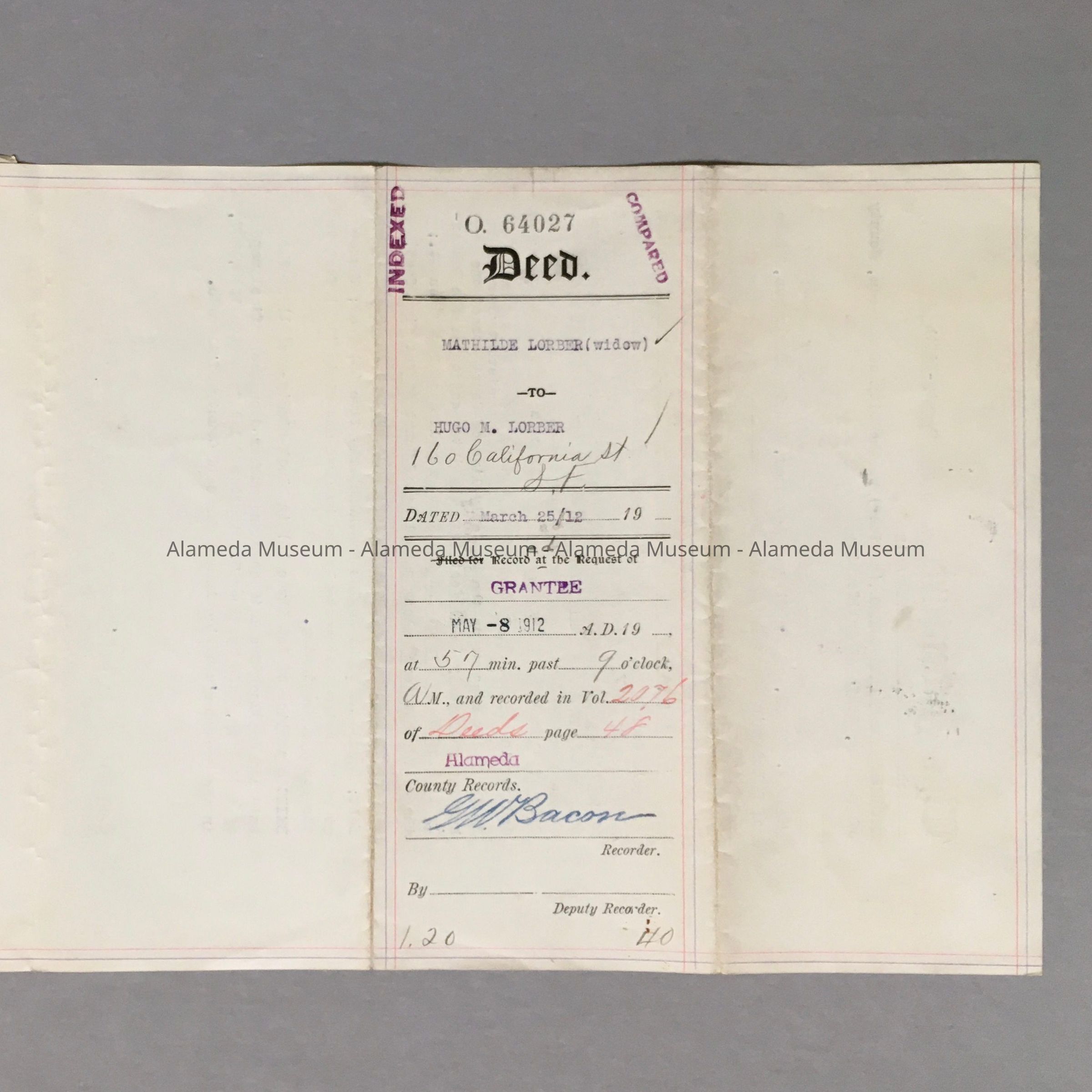 DEED BETWEEN MATHILDA LORBER AND HUGO M LORBER, FOR PROPERTY AT THE CORNER OF COURT AND VAN BUREN STREETS, ALAMEDA, CALIFORNIA.