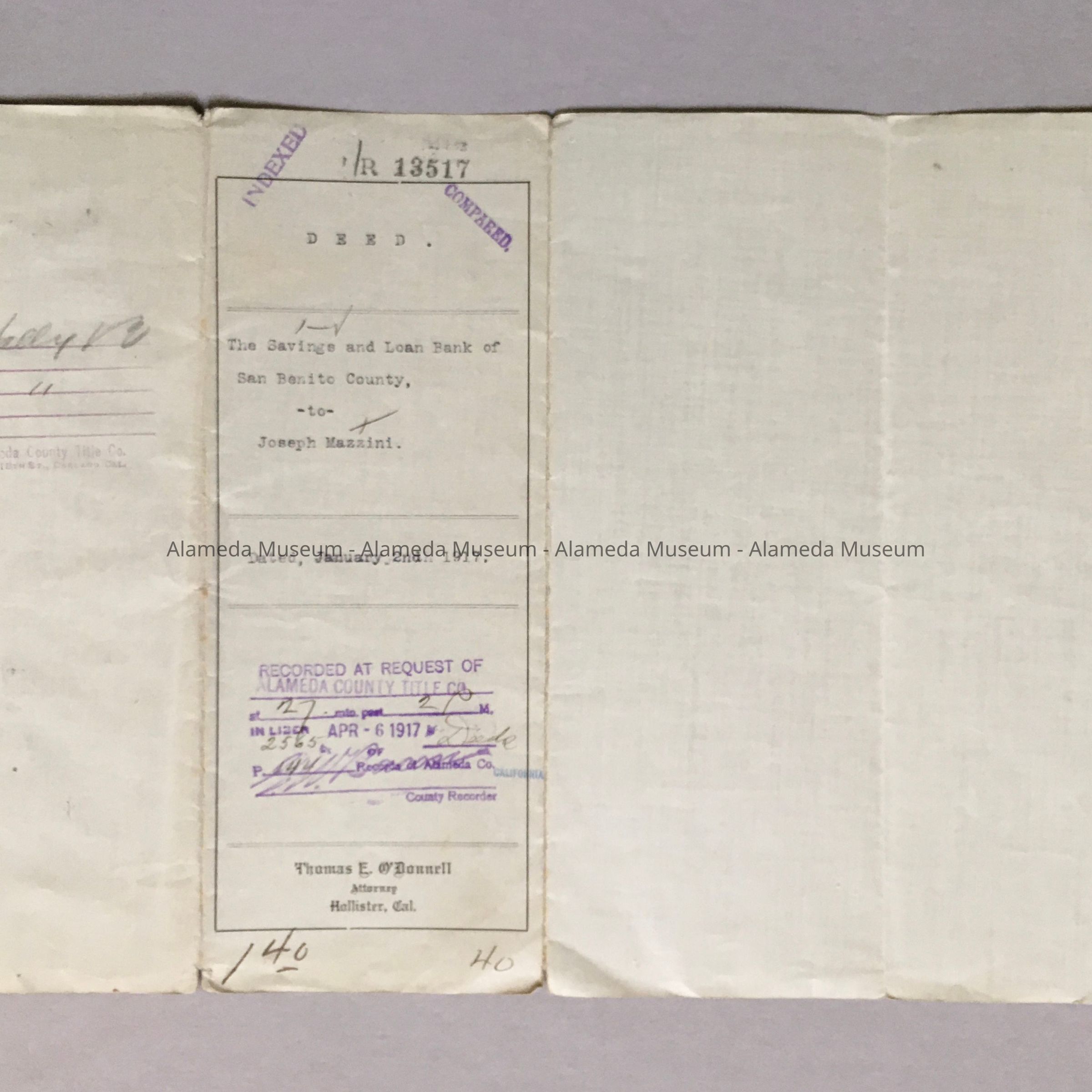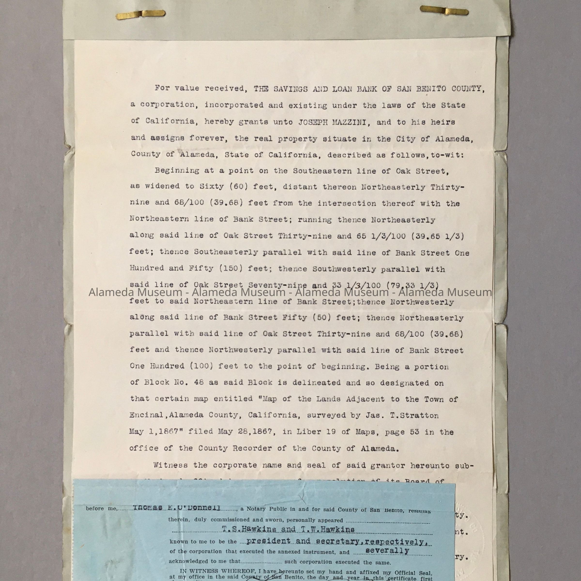 A DEED CONVEYING PROPERTY FROM THE SAVINGS AND LOAN BANK OF SAN BENITO COUNTY, CALIFORNIA, TO JOSEPH MAZZINI, FOR PROPERTY LOCATED ON OAK STREET NEAR BANK (NOW KNOWN AS TIMES-STAR WAY), ALAMEDA. THE DEED IS DATED APRIL 6, 1917.