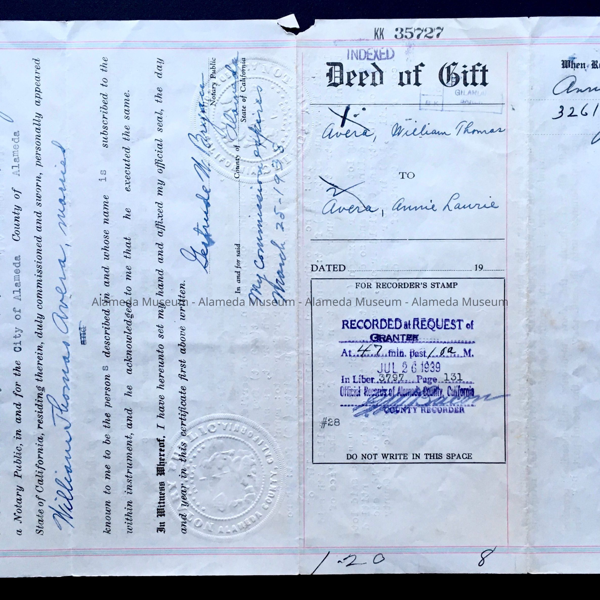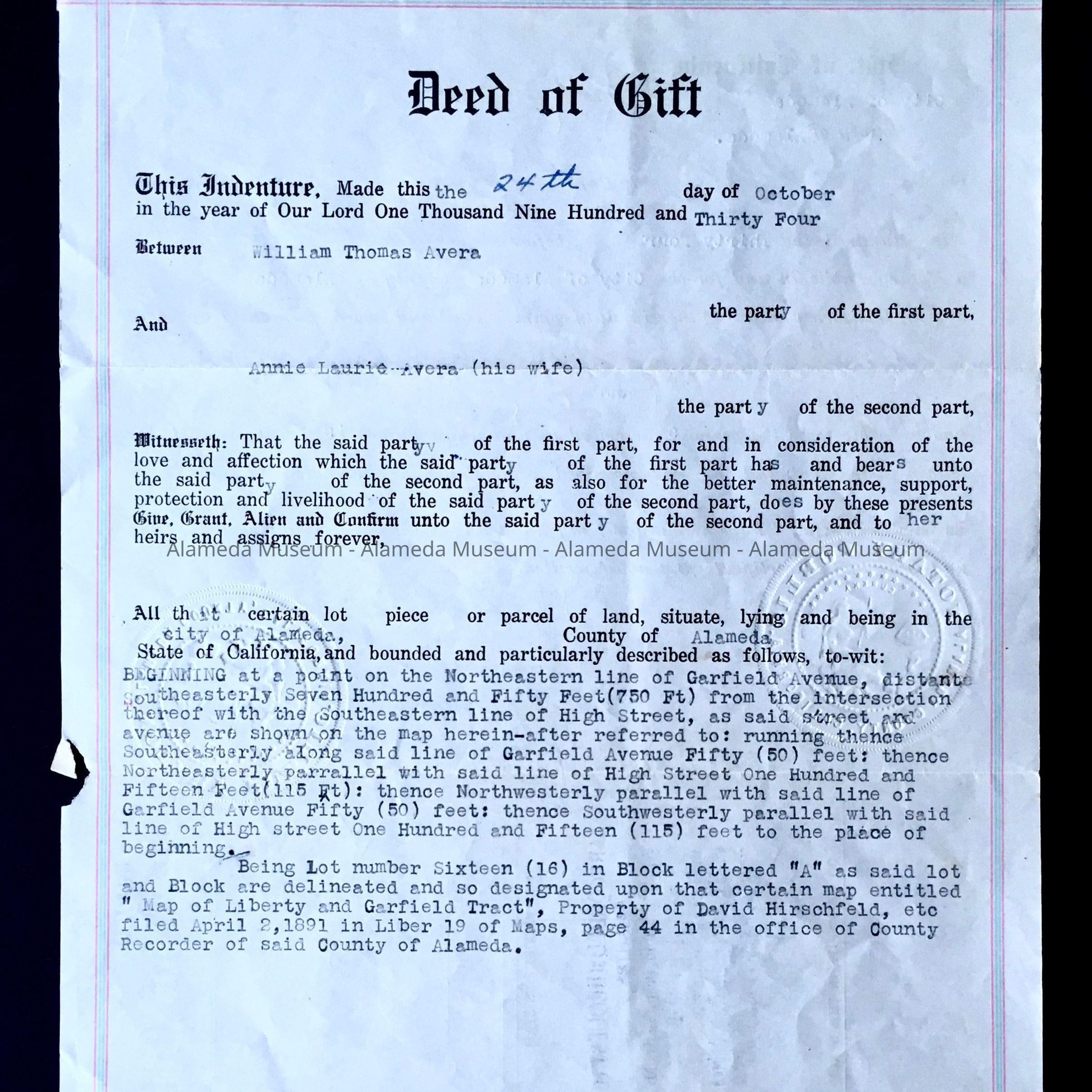 History of Object: Deed of gift from Wm. Thomas Avera to his wife, Annie Laurie, dated October 24, 1934. Deed to the property known as 3261 Garfield Avenue.