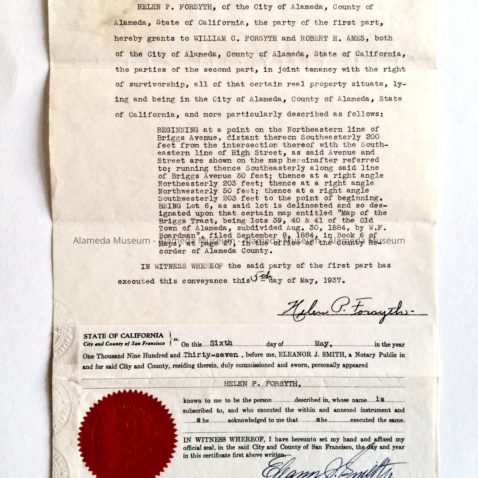 HISTORY OF OBJECT: A DEED WHERE HELENE P. FORSYTH GRANTS TO WILLIAM C. FORSYTH, HER HUSBAND, AND ROBERT H. AMES, HER SON, JOINT TENANCY AND OWNERSHIP OF THE PROPERTY 3219 BRIGGS AVENUE, ALAMEDA.