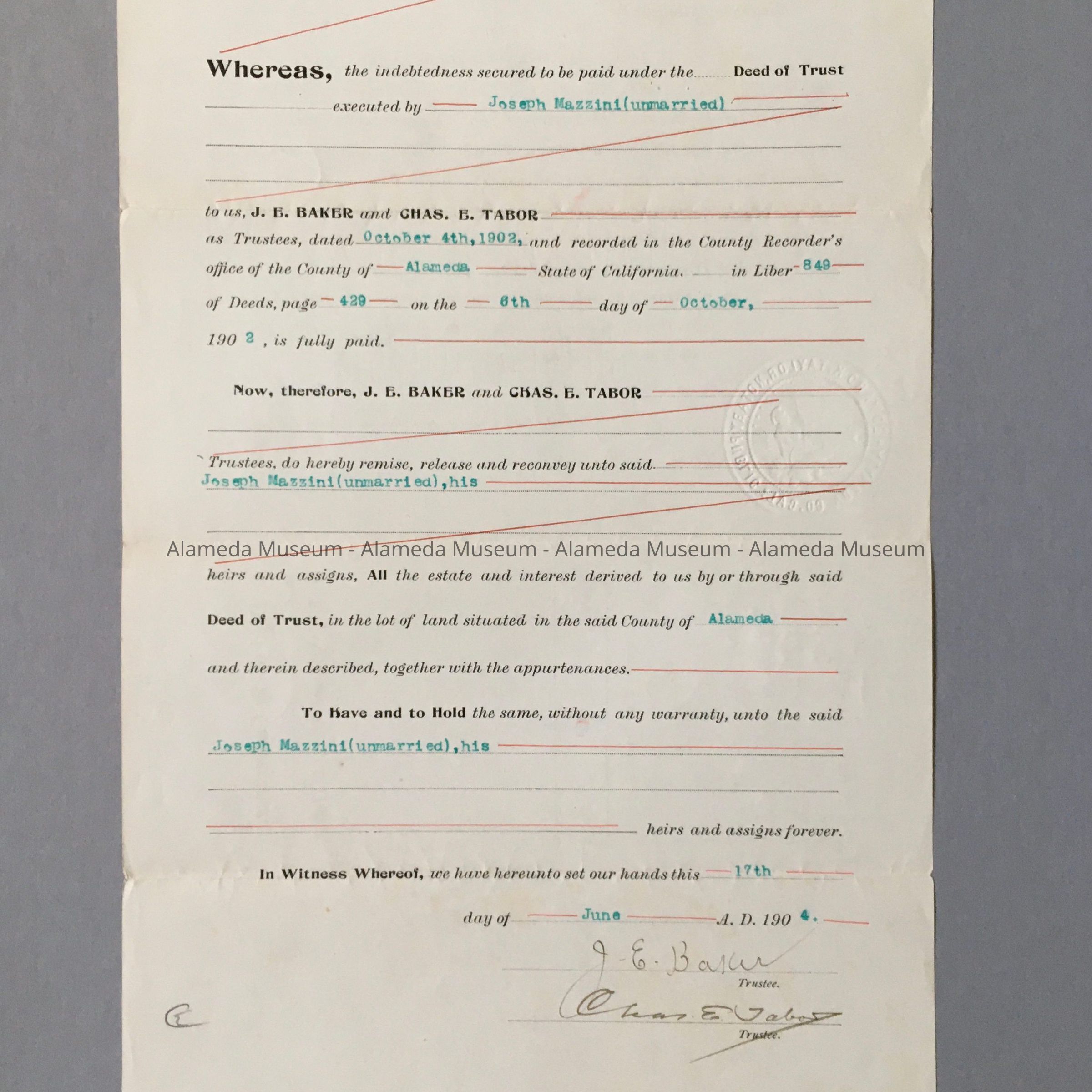 Deed of Re-Conveyance, release of claim on property to Joseph Mazzini, 1904Entry/Object ID