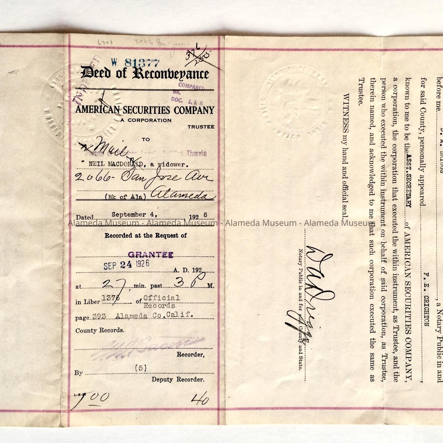 Deed of Reconveyance for 2066 San Jose Ave, to Neil Macdonald, 1926Entry/Object ID