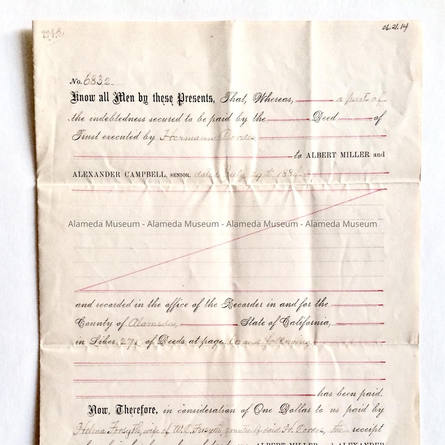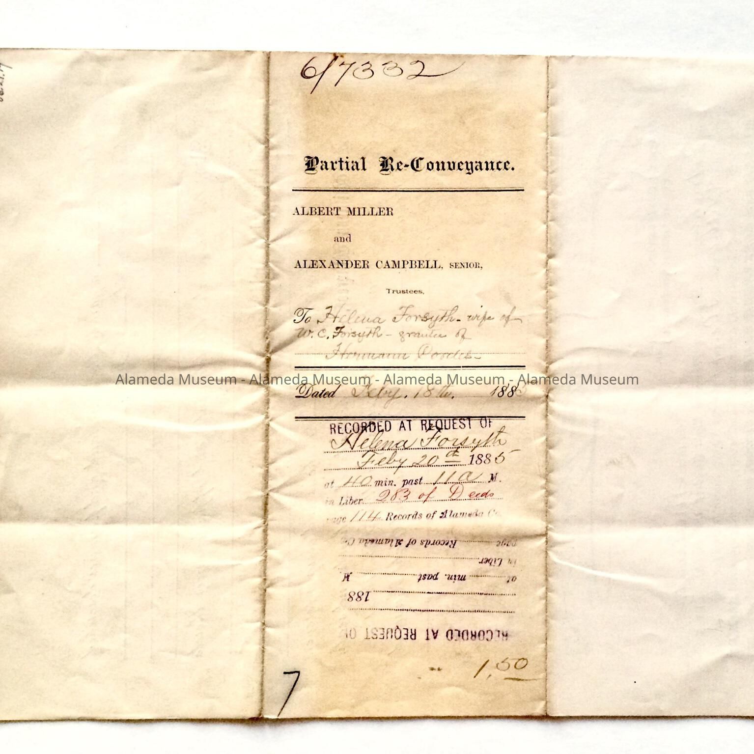 HISTORY OF OBJECT: A DEED OF RECONVEYANCE FORM FOR ALBERT MILLER AND ALEXANDER CAMPBELL, TRUSTEES TO HELEN FORSYTH, WIFE OF WILLIAM C. FORSYTH, DATED FEBRUARY 18, 1885 FOR THE PROPERTY 3219 BRIGGS AVENUE, ALAMEDA, CA.