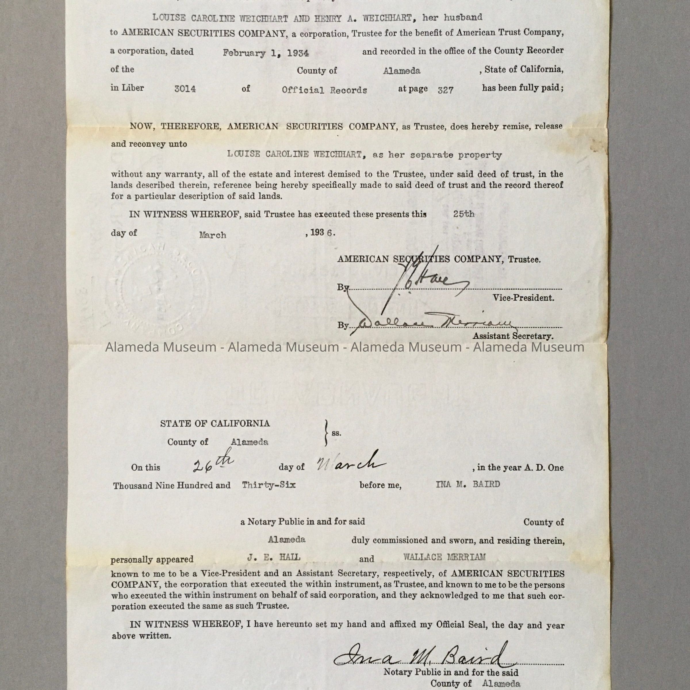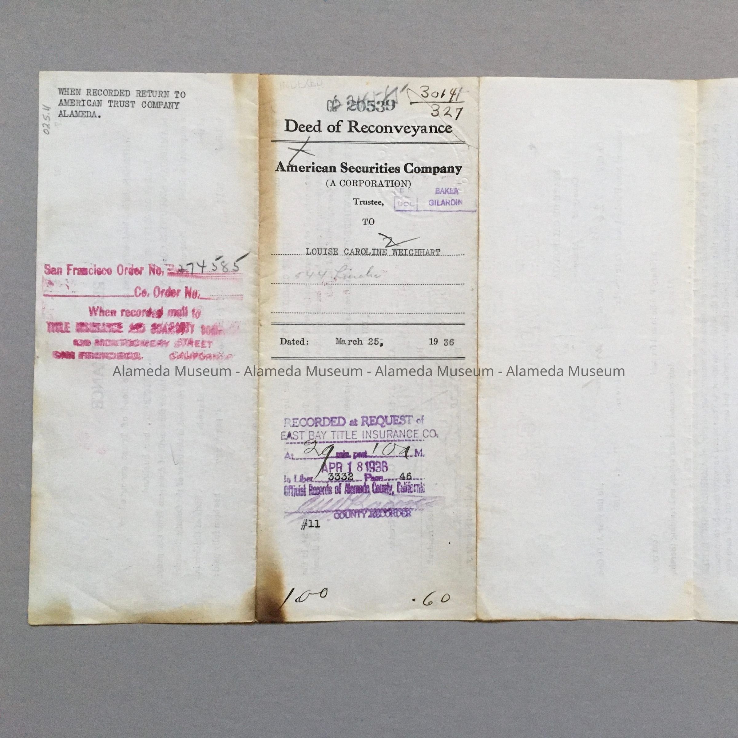 A DEED OF RECONVEYANCE FROM THE AMERICAN SECURITIES COMPANY, TRUSTEE, TO LOUISE CAROLINE WEICHART, FOR PROPERTY @ 544 LINCOLN AVENUE, ALAMEDA, CA.