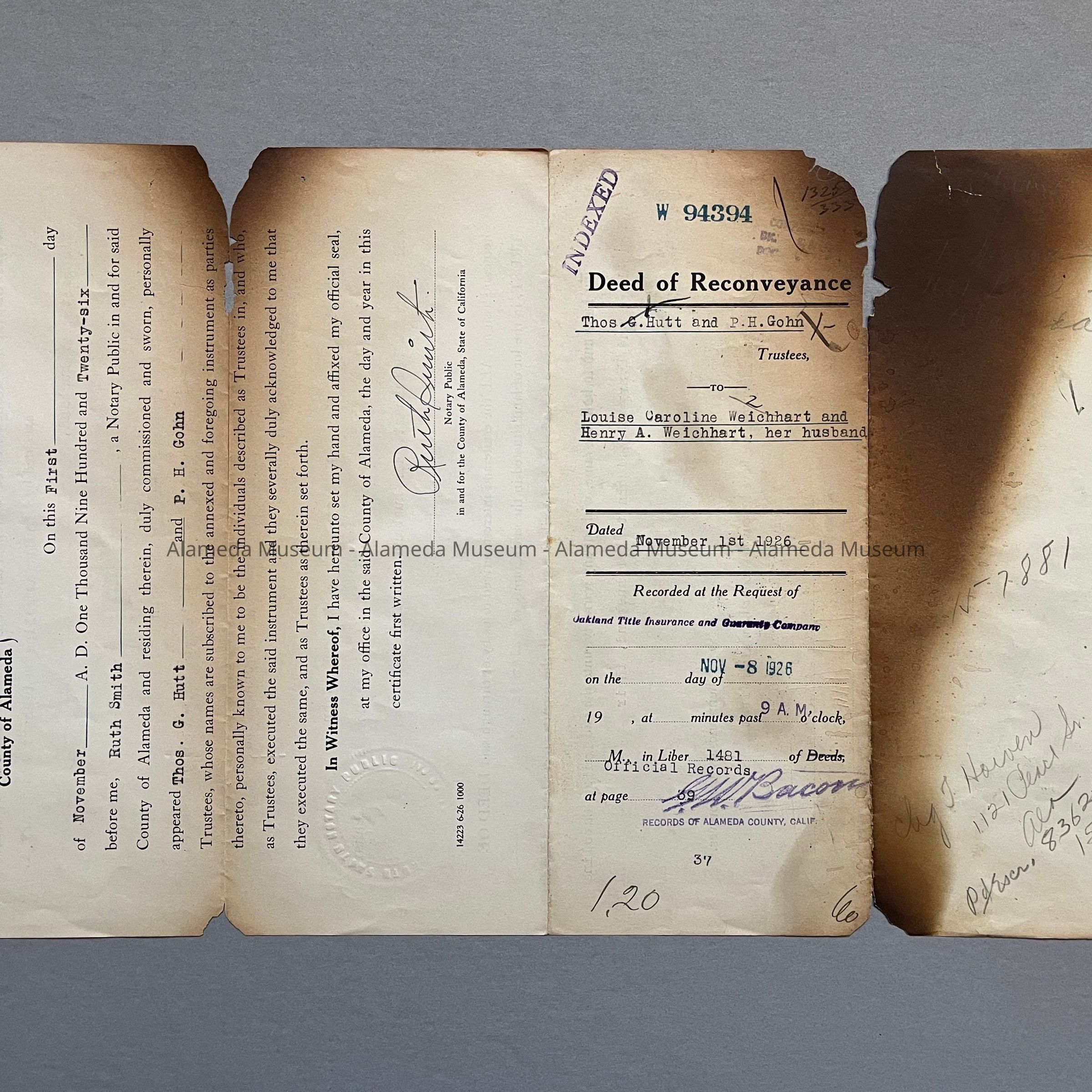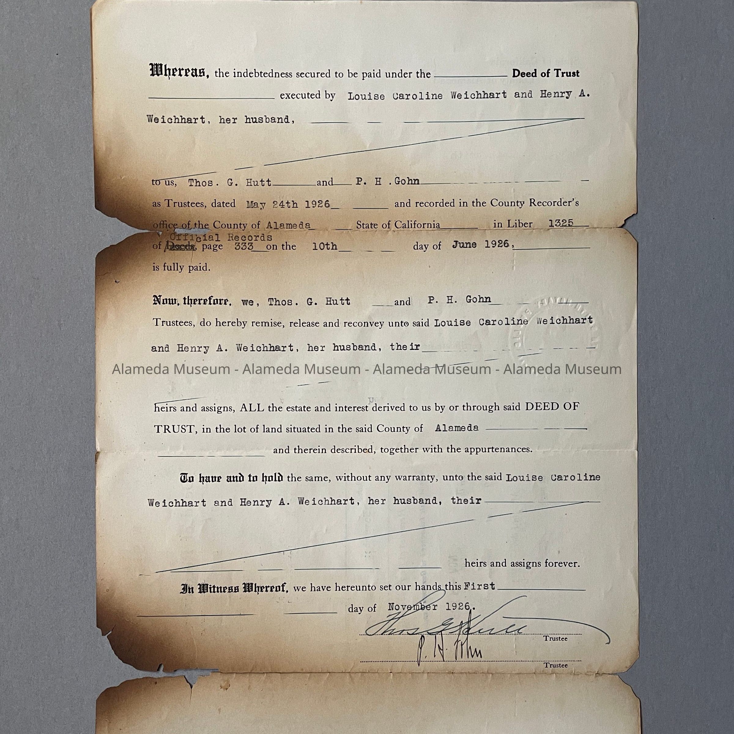 A DEED OF RECONVEYANCE FROM THOMAS A HOLT AND P H GOHN TO LOUISE CAROLINE WEICHART AND HENRY A WEICHART (LOUISE'S HUSBAND), DATED NOVEMBER 1, 1926; PROPERTY LOCATION UNKNOWN.