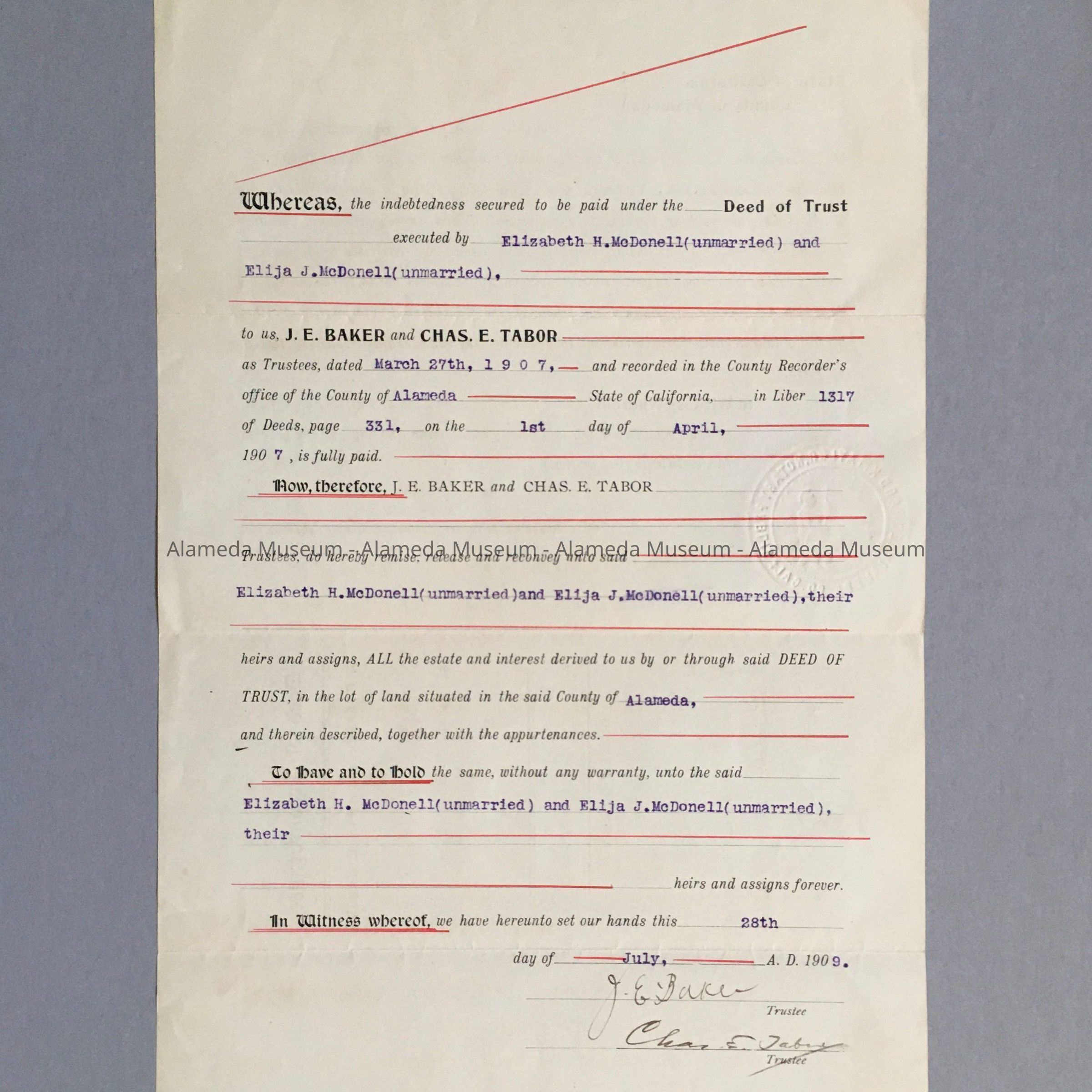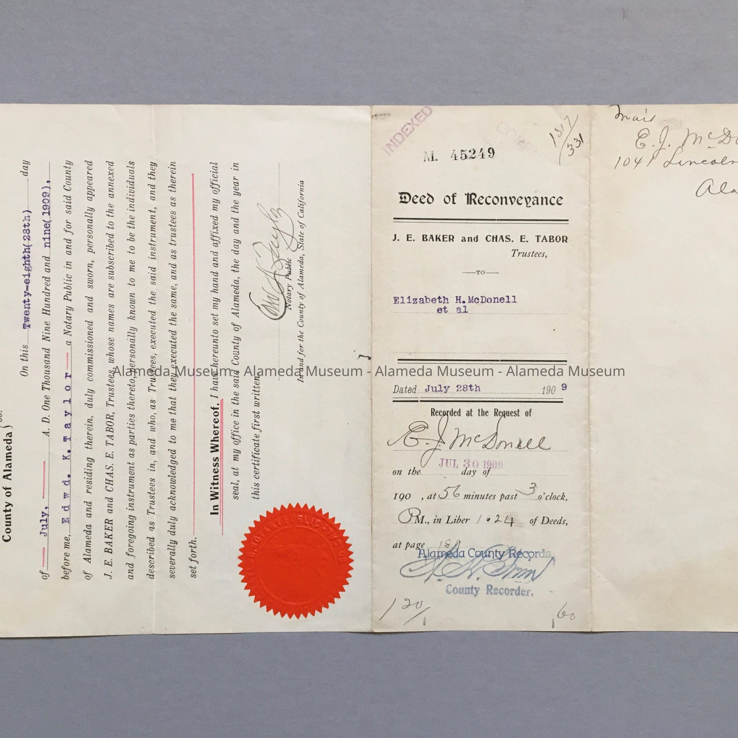 Deed of Reconveyance of 1041 Lincoln Ave, 1909Entry/Object ID
