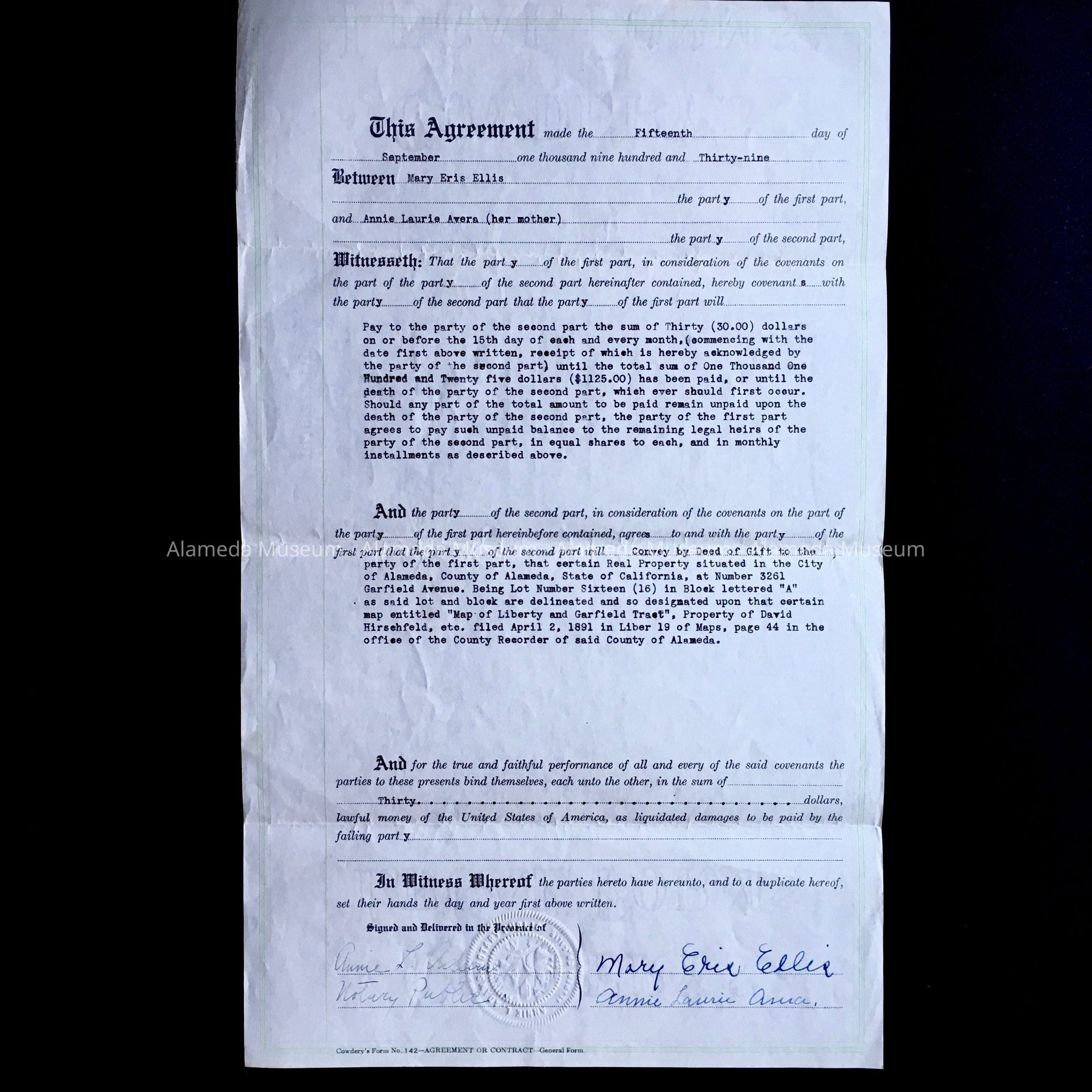 Agreement by which Annie Laurie Avera sells to Mary Eris Ellis the property known as 3261 Garfield Avenue, for $1,125. Dated September 15, 1939.