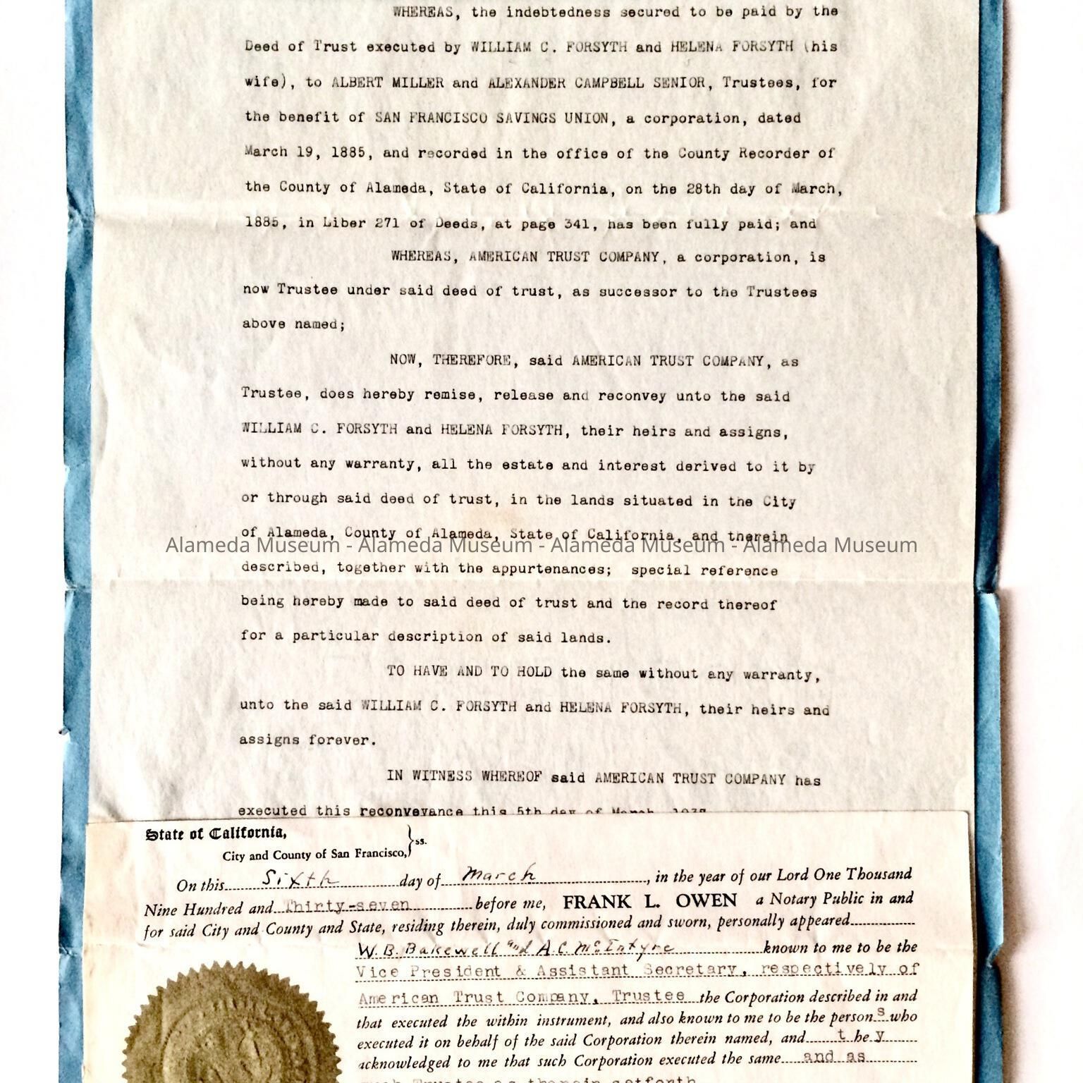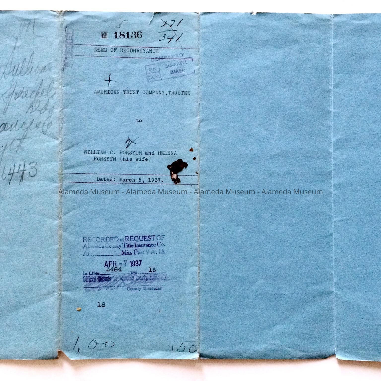 HISTORY OF OBJECT: A DEED STATING PROPERTY AT 3219 BRIGGS AVENUE, ALAMEDA HAS BEEN PAID FOR AND THAT IT IS OWNED BY WILLIAM C. AND HELENA FORSYTH.
