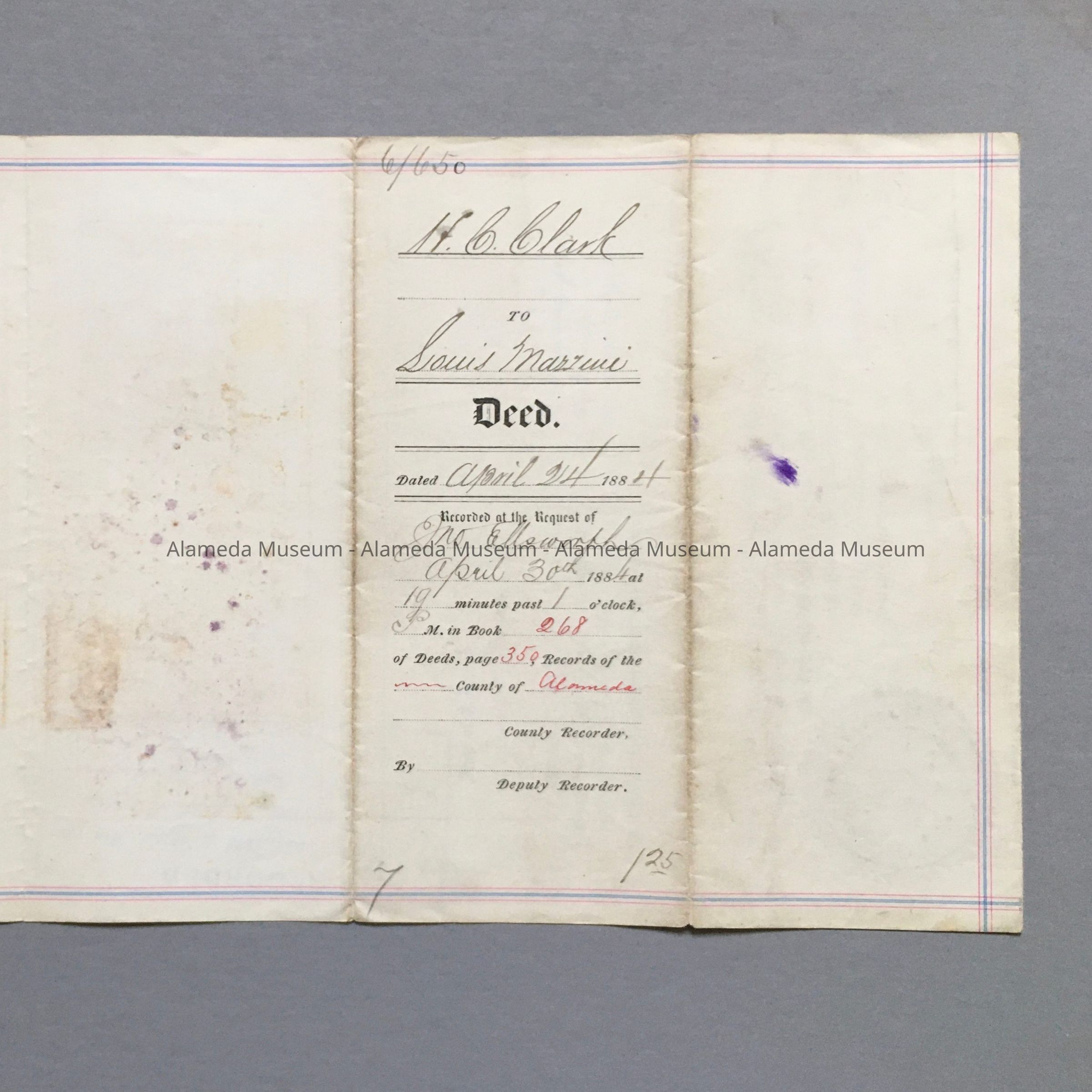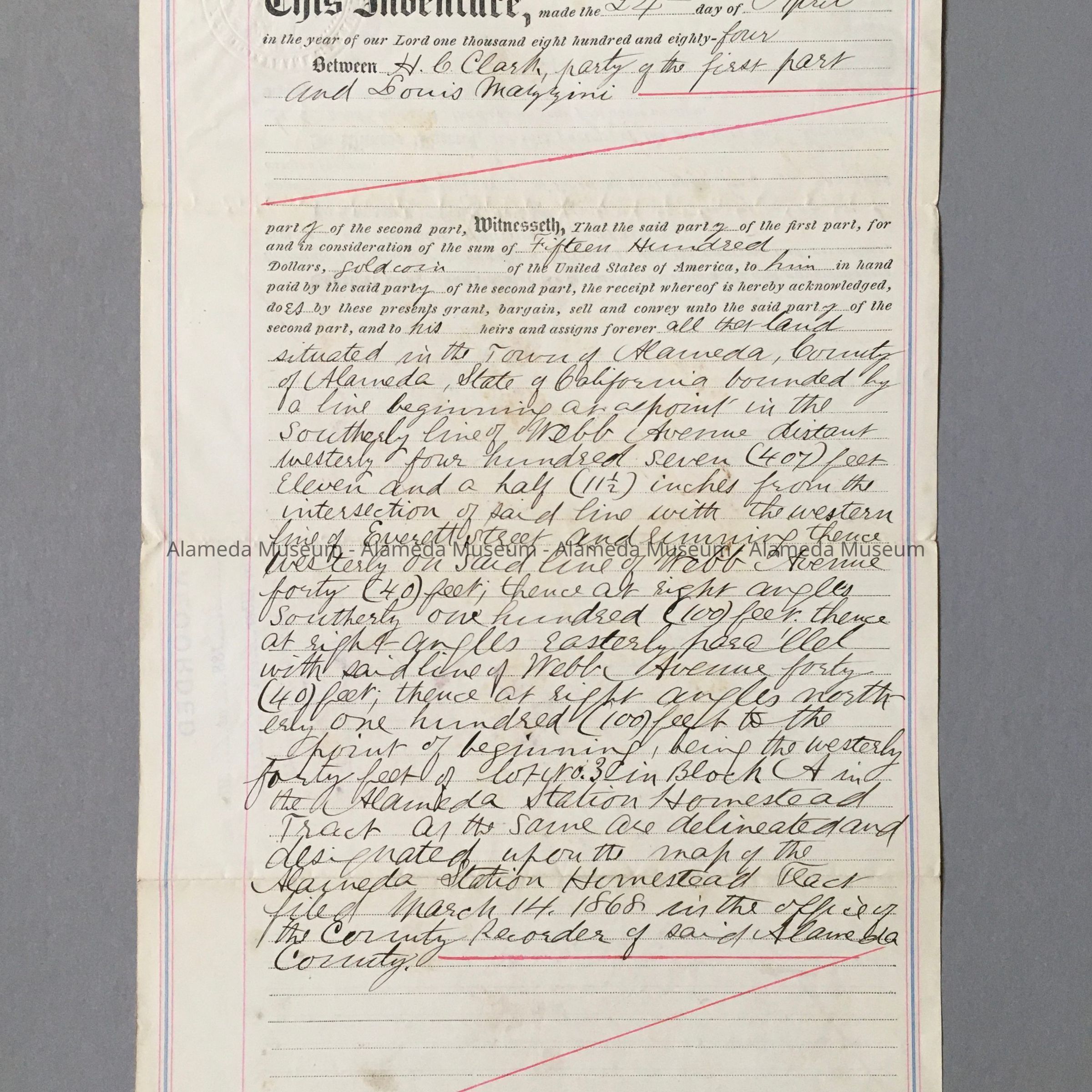 HISTORY OF OBJECT: AN INDENTURE MADE, APRIL 24, 1884, BETWEEN H. C. CLARK WITH LOUIS MAZZINI, FOR PROPERTY LOCATED ON THE SOUTH SIDE OF WEBB AVENUE, WEST OF EVERETT STREET. THE DOCUMENT IS SIGNED BY FRANK J. KRAUTH, ACTING AS NOTARY PUBLIC.