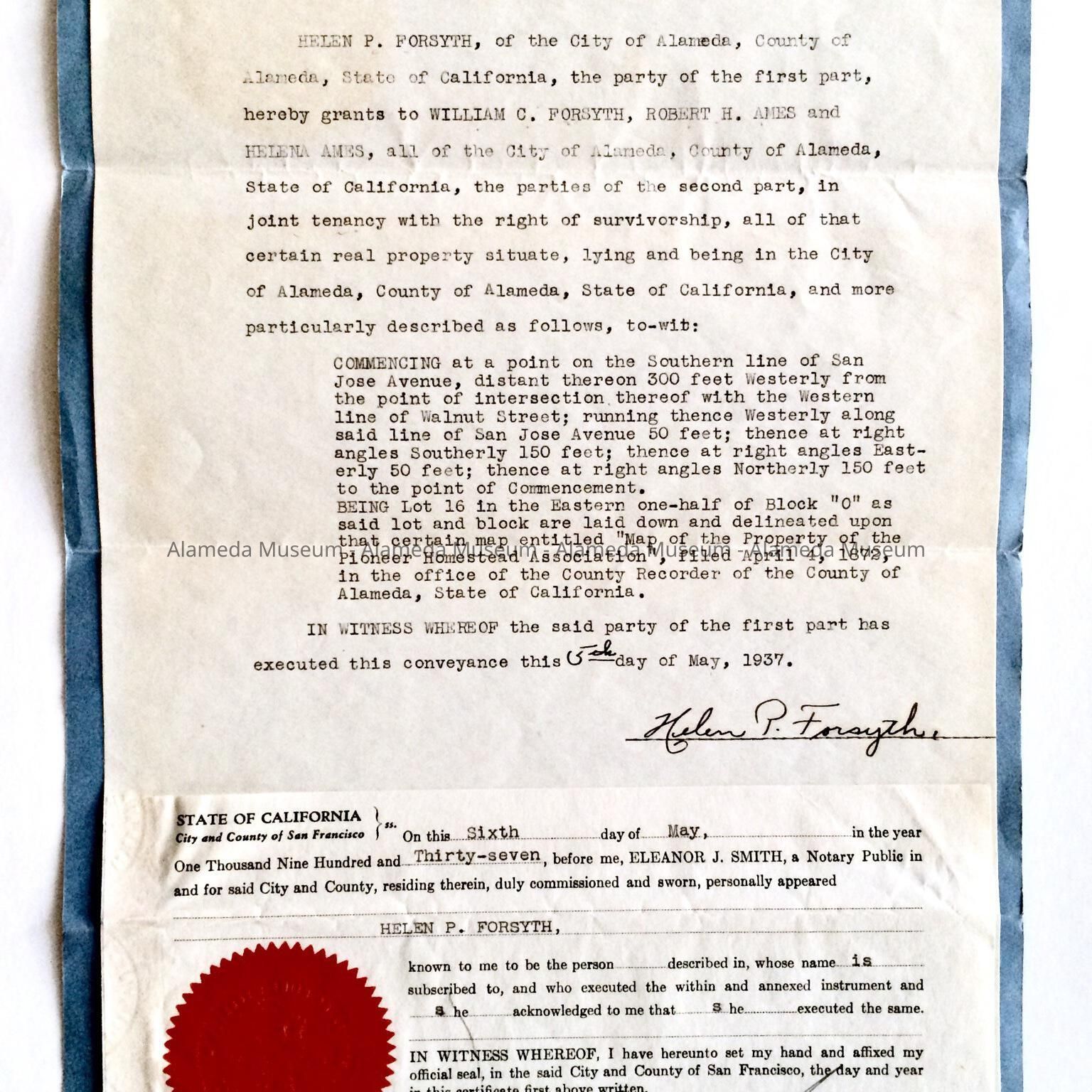 HISTORY OF OBJECT: A DEED SIGNED BY HELENE P. FORSYTH, GRANTING THE OWNER OF PROPERTY AS JOINT TENANCY TO HER HUSBAND, WILLIAM C. FORSYTH, HER SON, ROBERT H. AMES, AND DAUGHTER, HELENA AMES, FOR THE PROPERTY AT 2146 SAN JOSE AVENUE, ALAMEDA; SIGNED AND DATED ON MAY 5, 1937.