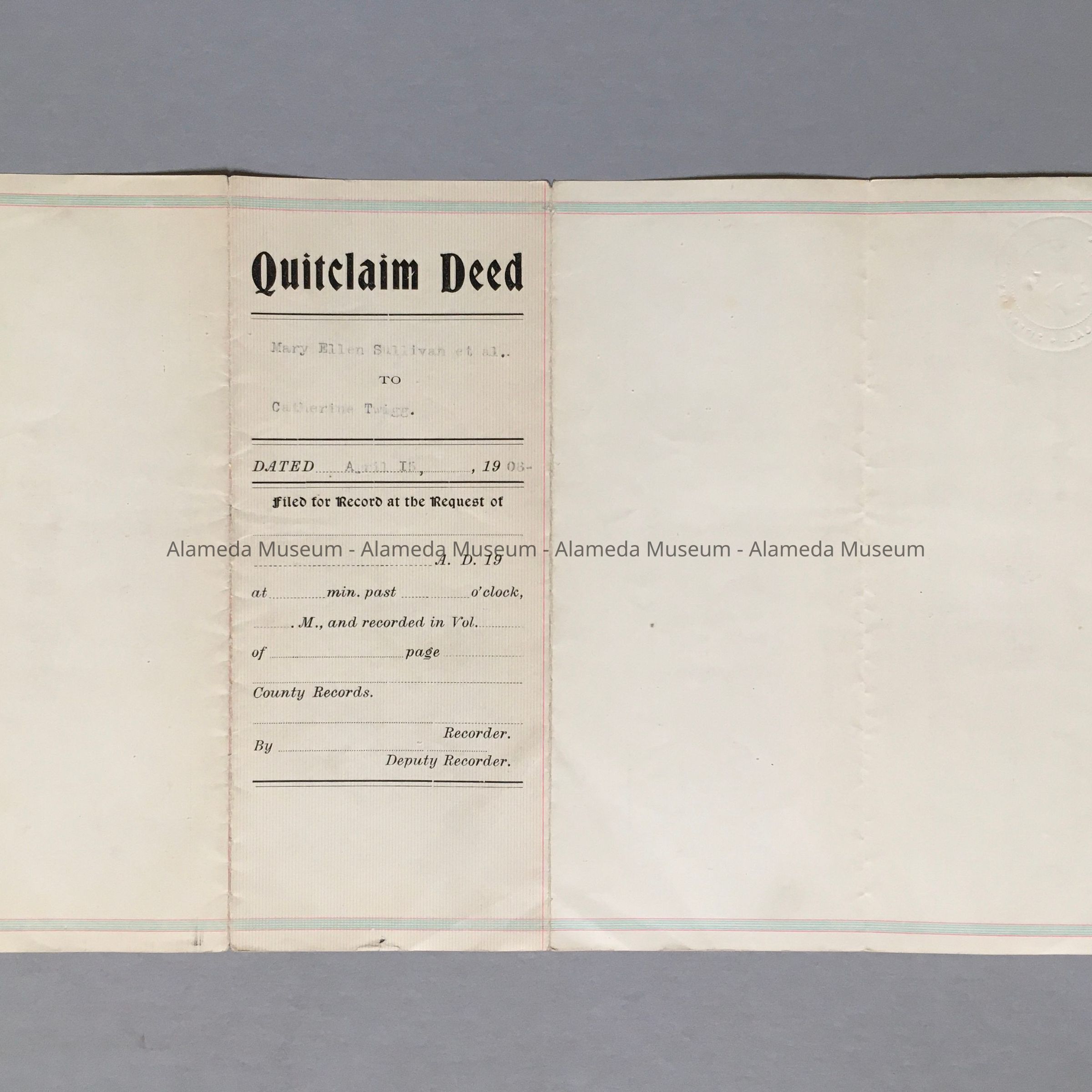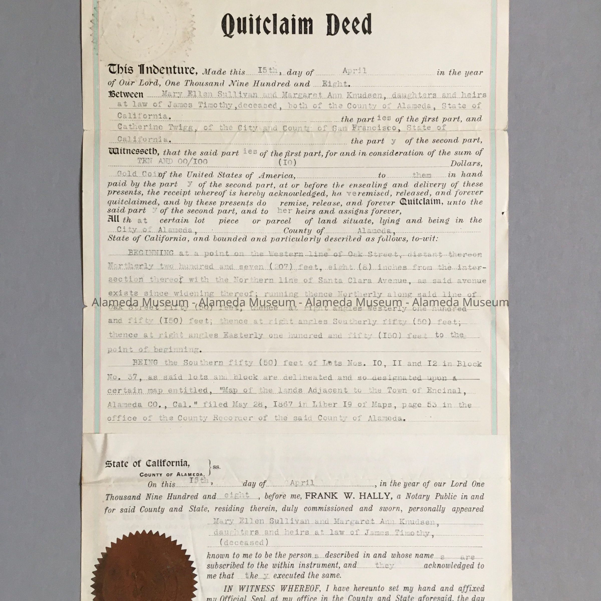 HISTORY OF OBJECT: AN INDENTURE MADE APRIL 15, 1908, BETWEEN MARY ELLEN SULLIVAN AND MARGARET ANN KNUDSEN, DAUGHTERS AND HEIRS OF JAMES TIMOTHY, DECEASED, BOTH OF THE COUNTY OF ALAMEDA, STATE OF CALIF, WITH CATHERINE TWIGG, OF THE CITY AND COUNTY OF SAN FRANCISCO, STATE OF CALIF. THE PROPERTY IS DESCRIBED WITH A LEGAL DESCRIPTION (LOCATED ON THE WEST SIDE OF OAK STREET, BETWEEN SANTA CLARA AND LINCOLN AVENUES). NOW THE SITE OF THE CITY HALL PARKING LOT. THE DOCUMENT IS SIGNED BY MARY ELLEN SULLIVAN, MARGARET ANN KNUDSEN, AND FRANK W. HALLY, A NOTARY PUBLIC.