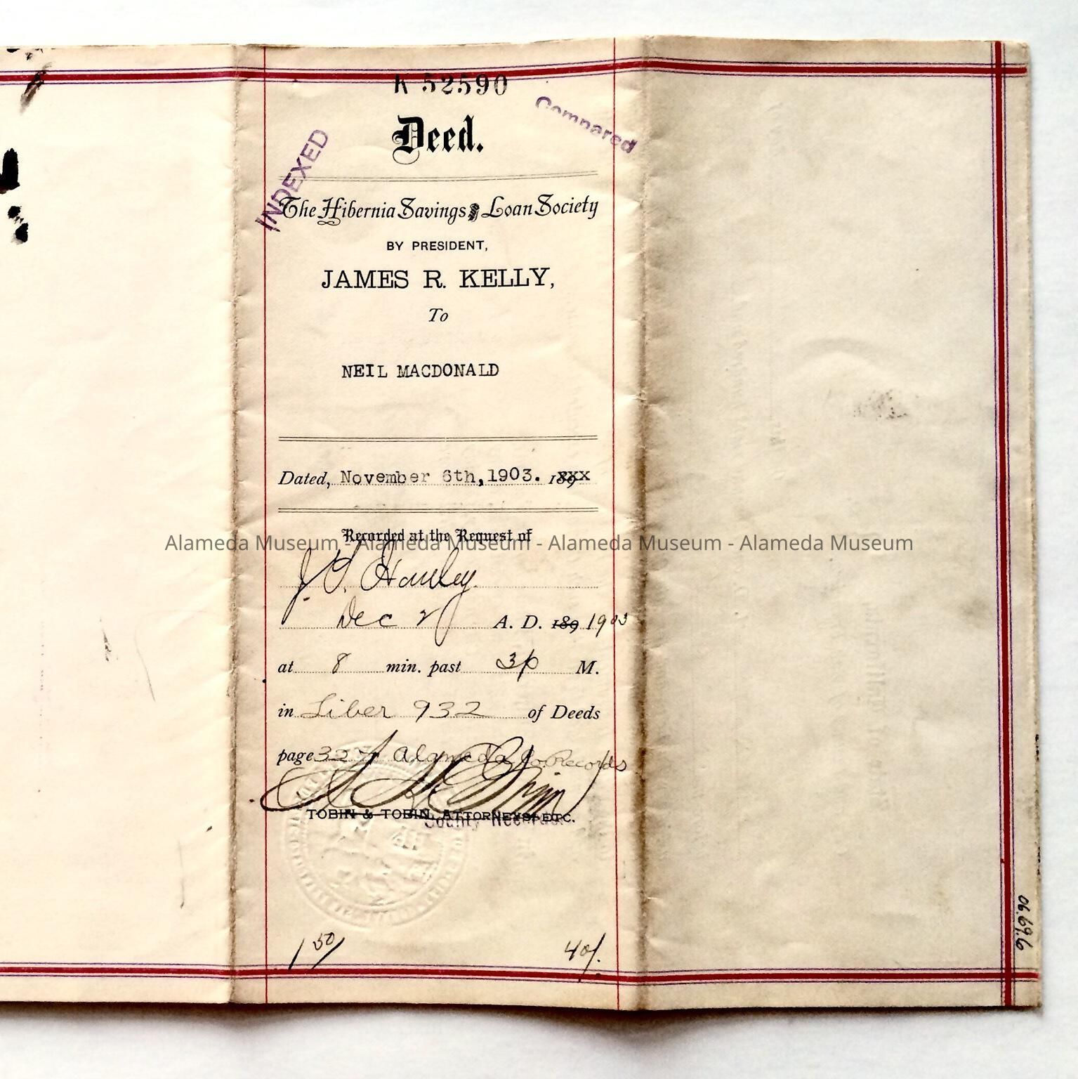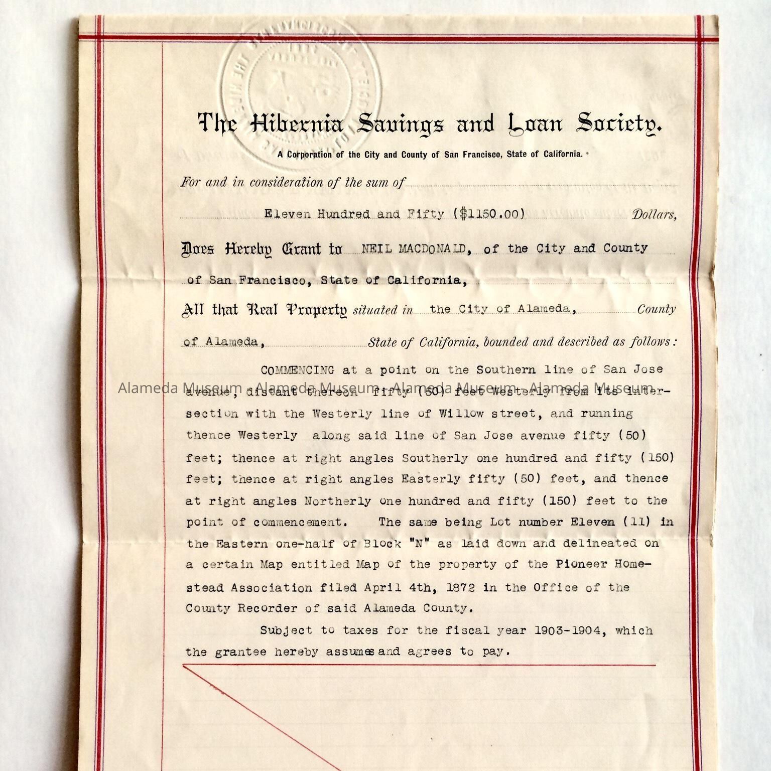 A DEED FROM THE HIBERNIA SAVINGS & LOAN SOCIETY TO NEIL MACDONALD, DATED NOVEMBER 6, 1903, CONCERNING THE PROPERTY KNOWN AS 2066 SAN JOSE AVENUE, ALAMEDA .