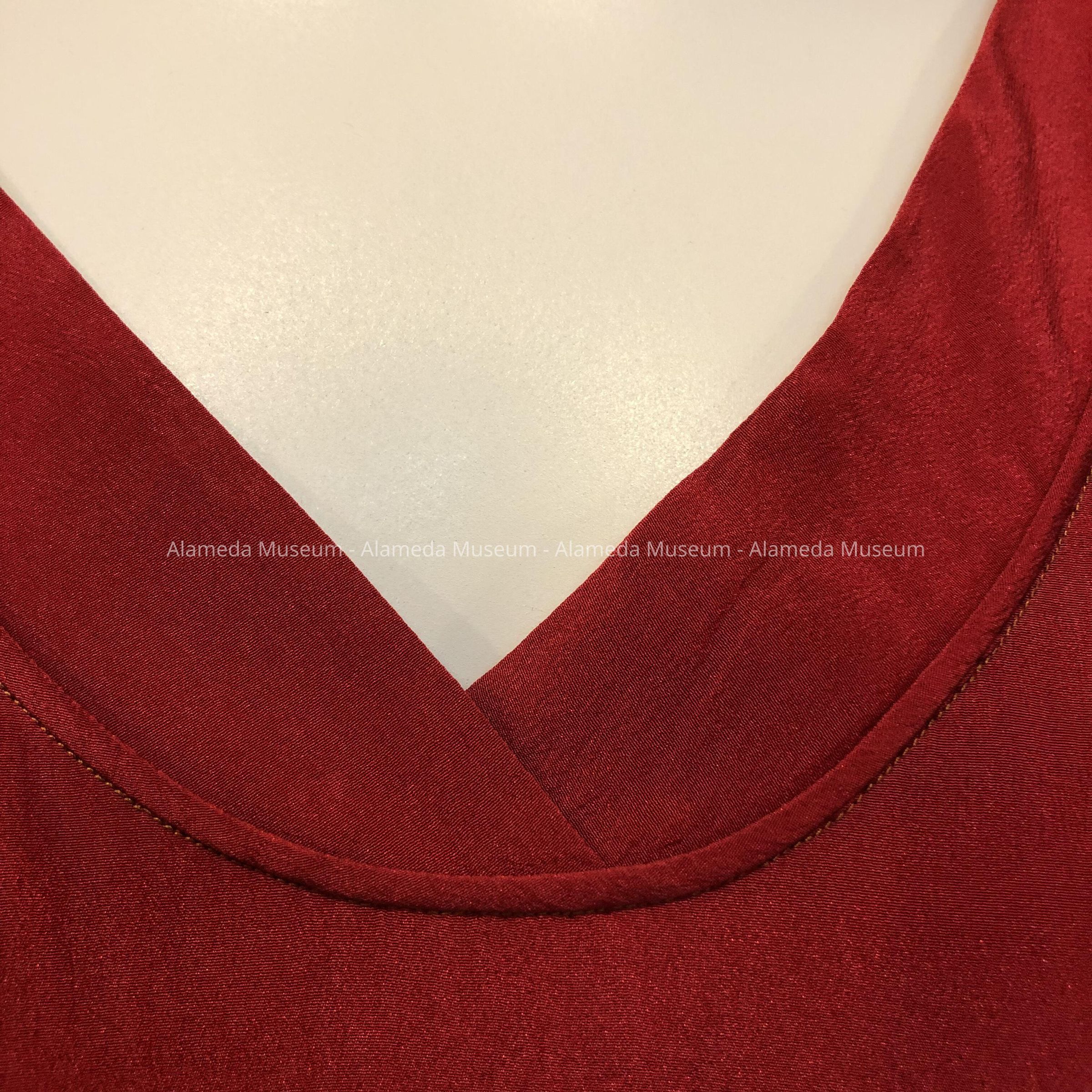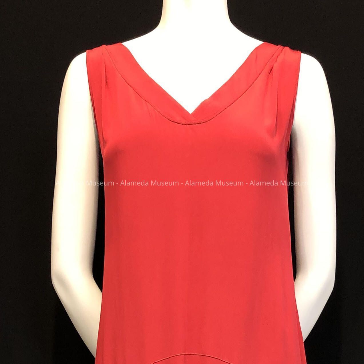 Deep red crepe dress has shallow V-neck front and deep v-neck back. Dropped waist and full skirt has structure seams on back of skirt.