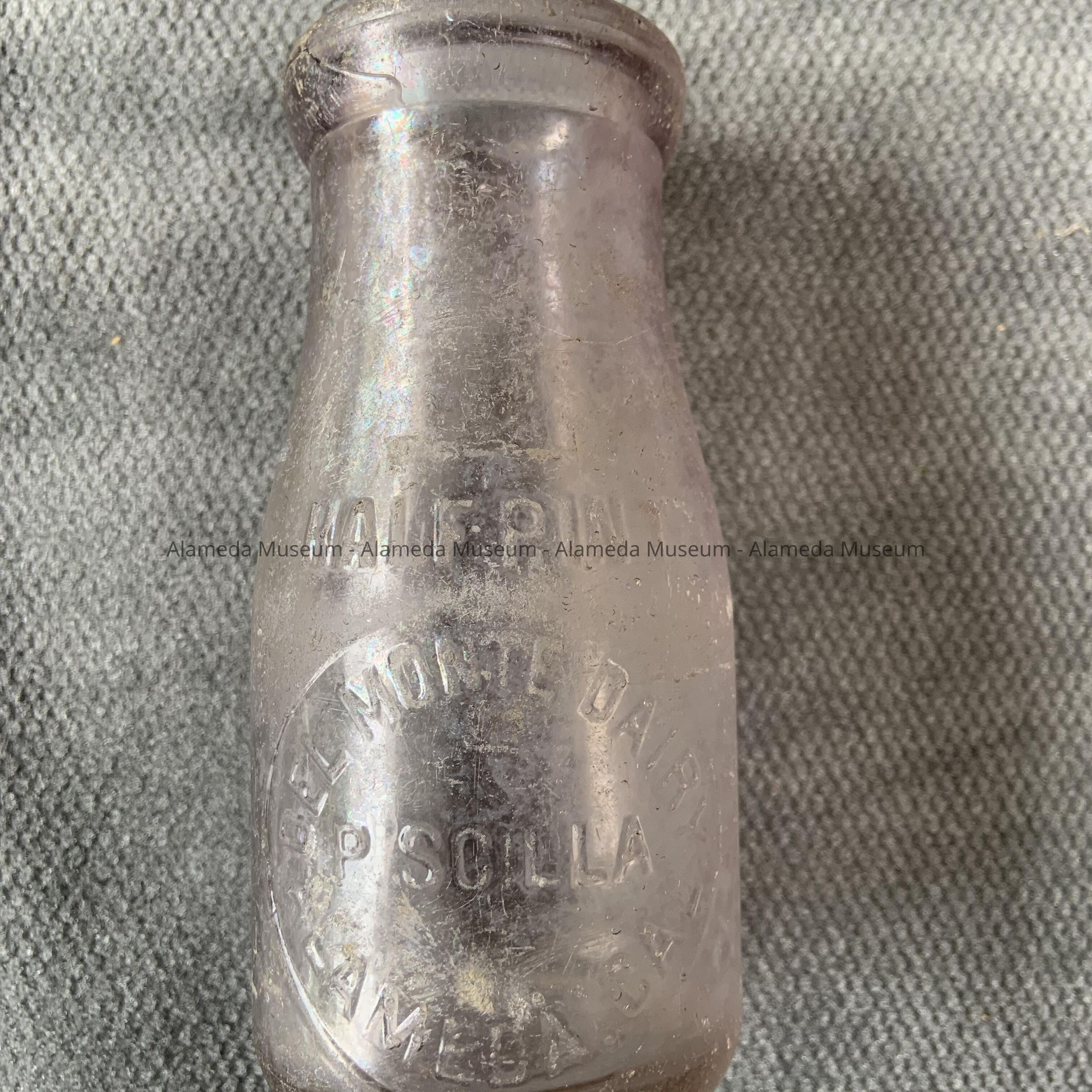 Description: Half pint milk bottle, raised lettering in circular-like label stating "Del Monte Dairy, P. Scilla, Alameda, Cal", and above the label "half pint". The glass has turned a lavender shade. The bottle has a protruding lip with recessed ledge for supporting paper top.