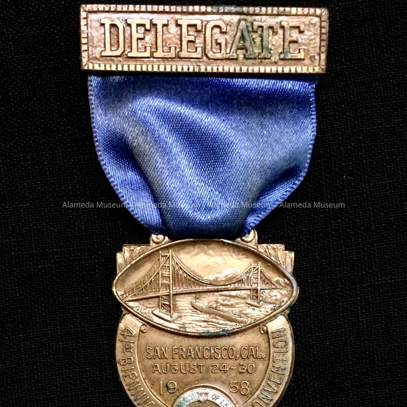 MEDAL, WITH EMBLEM HANGING FROM A DARK BLUE-COLORED RIBBON, ATTACHED TO A RECTANGULAR-SHAPED BAR PIN. FACE OF THE BAR PIN HAS AN EMBOSSED CAPTION, "DELEGATE." EMBLEM PART OF MEDAL HAS EMBOSSED LETTERING AND A SCENE OF THE GOLDEN GATE BRIDGE.