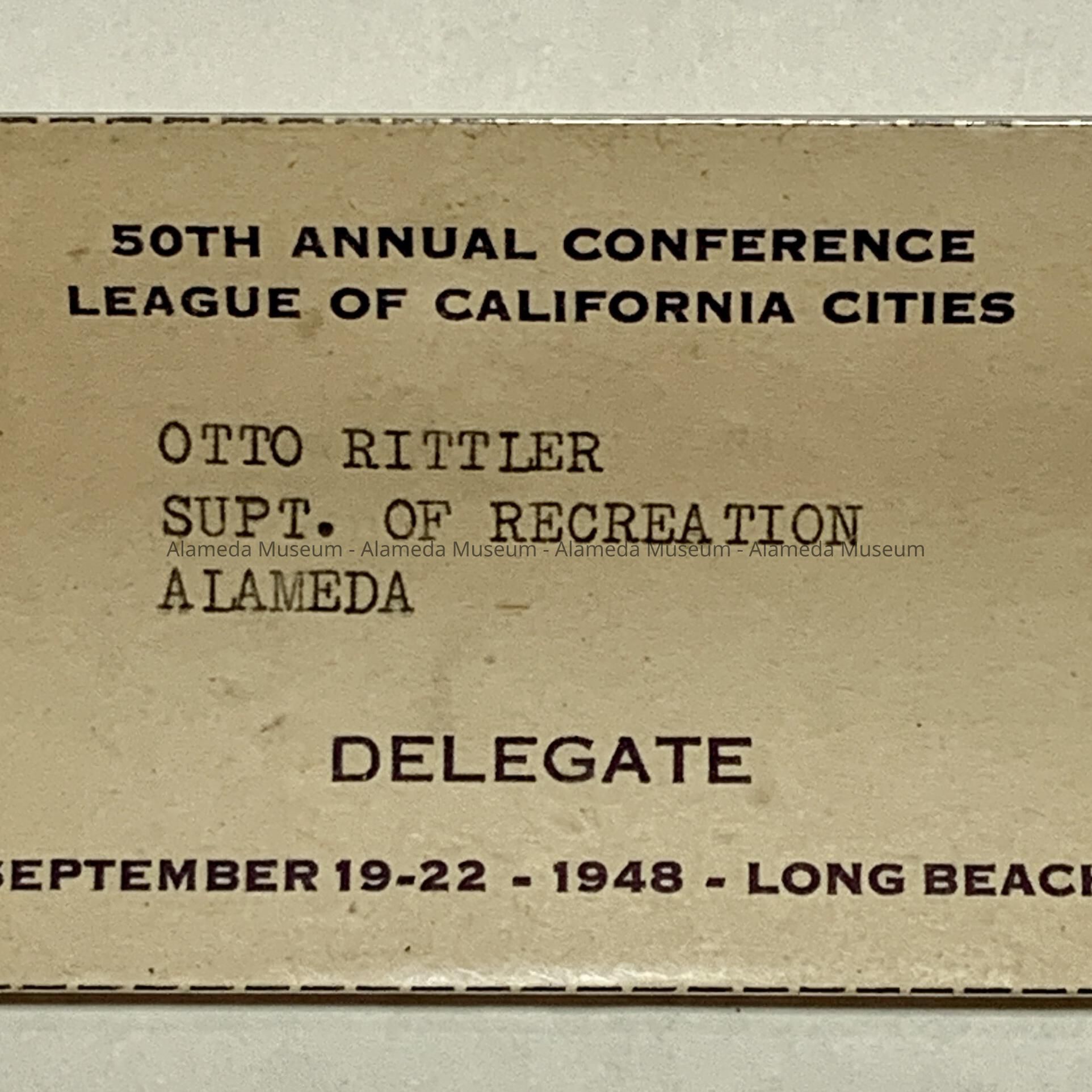 A DELEGATION BADGE WORN BY OTTO RITTLER AT THE 50th ANNUAL CONFERENCE OF THE LEAGUE OF CALIFORNIA CITIES. MR. RITTLER REPRESENTED THE CITY OF ALAMEDA'S RECREATION DEPARTMENT.