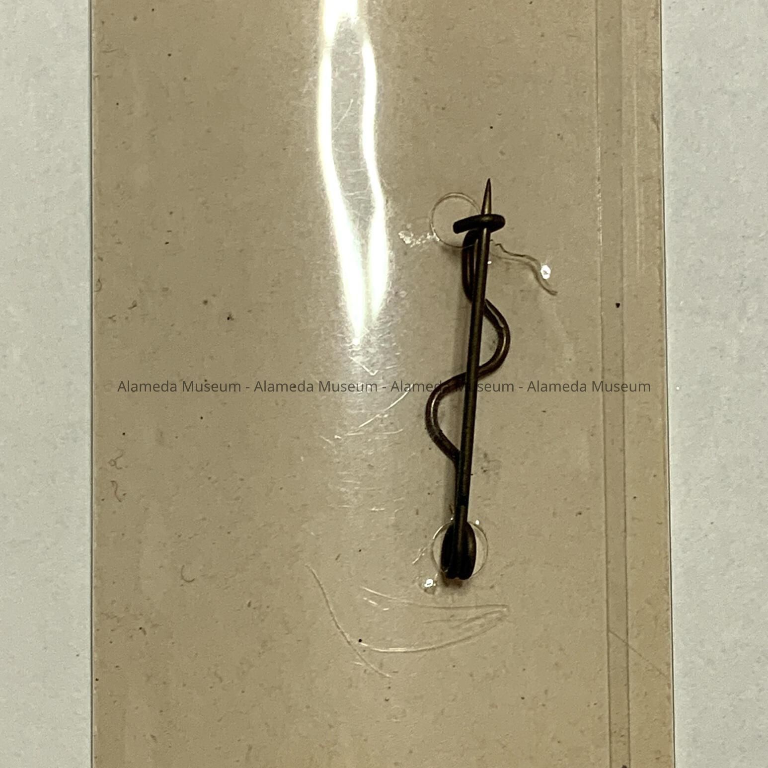 A CLEAR PLASTIC BADGE, WITH TYPESET AND TYPEWRITTEN PRINTED CAPTION IN BLUE-COLORED TYPE. BADGE IS SECURED BY A BRASS PIN.