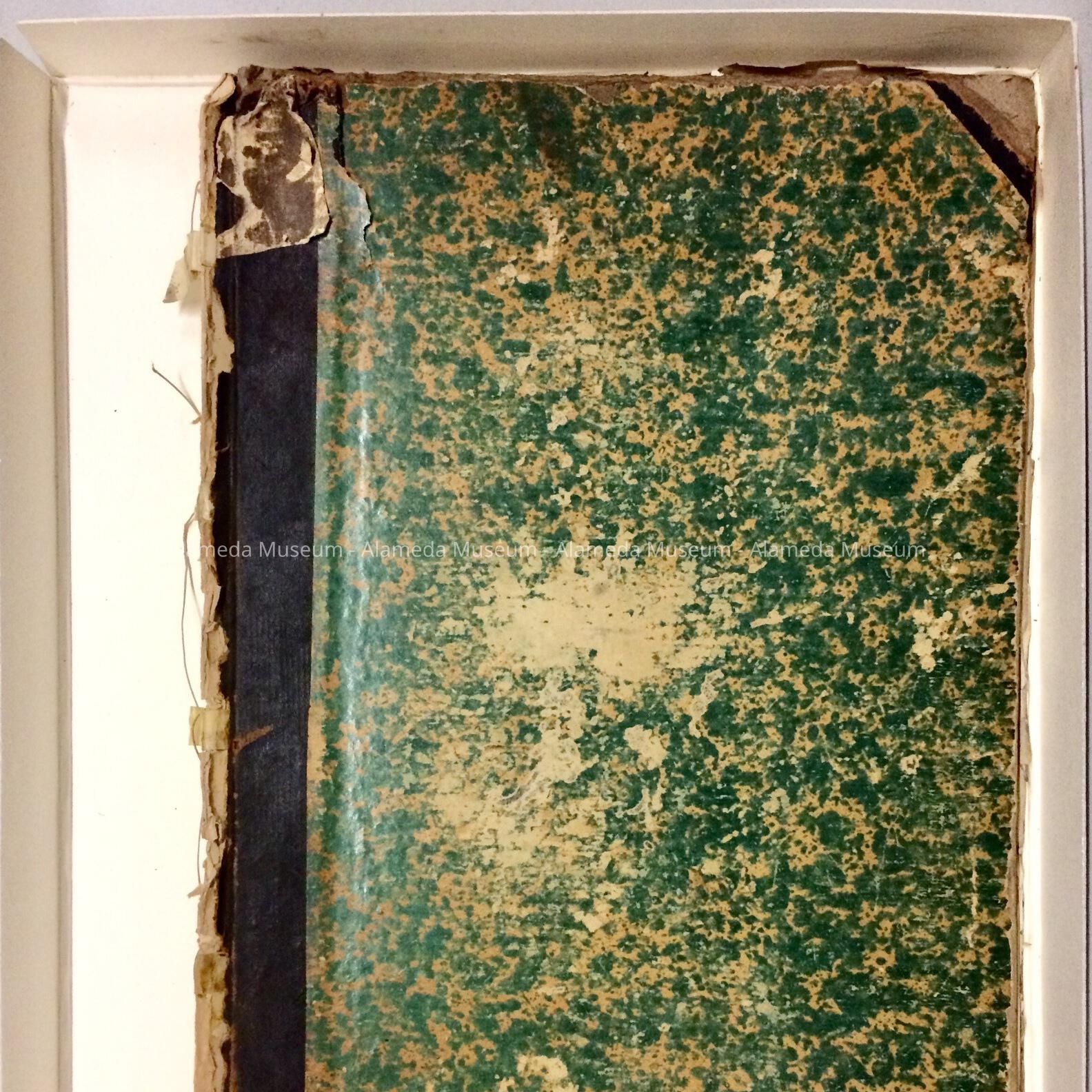 Description: Hardbound book with cover of green-colored pattern paper trimmed in black color leather. Interior is ruled paper with handwritten entries.