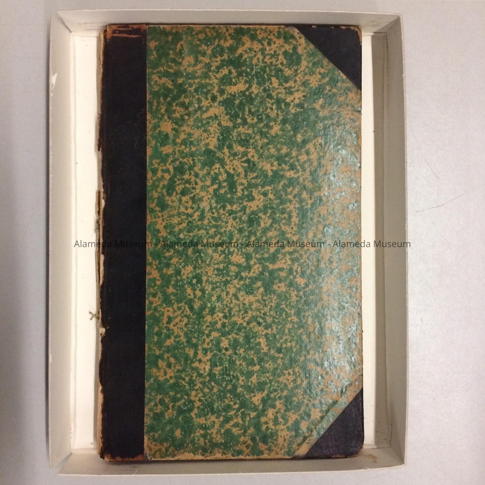 Description: Hardbound book with cover of green cover pattern paper trimmed in black colored leather. Interior has pasted in newspaper clippings concerning delinquent tax sales.