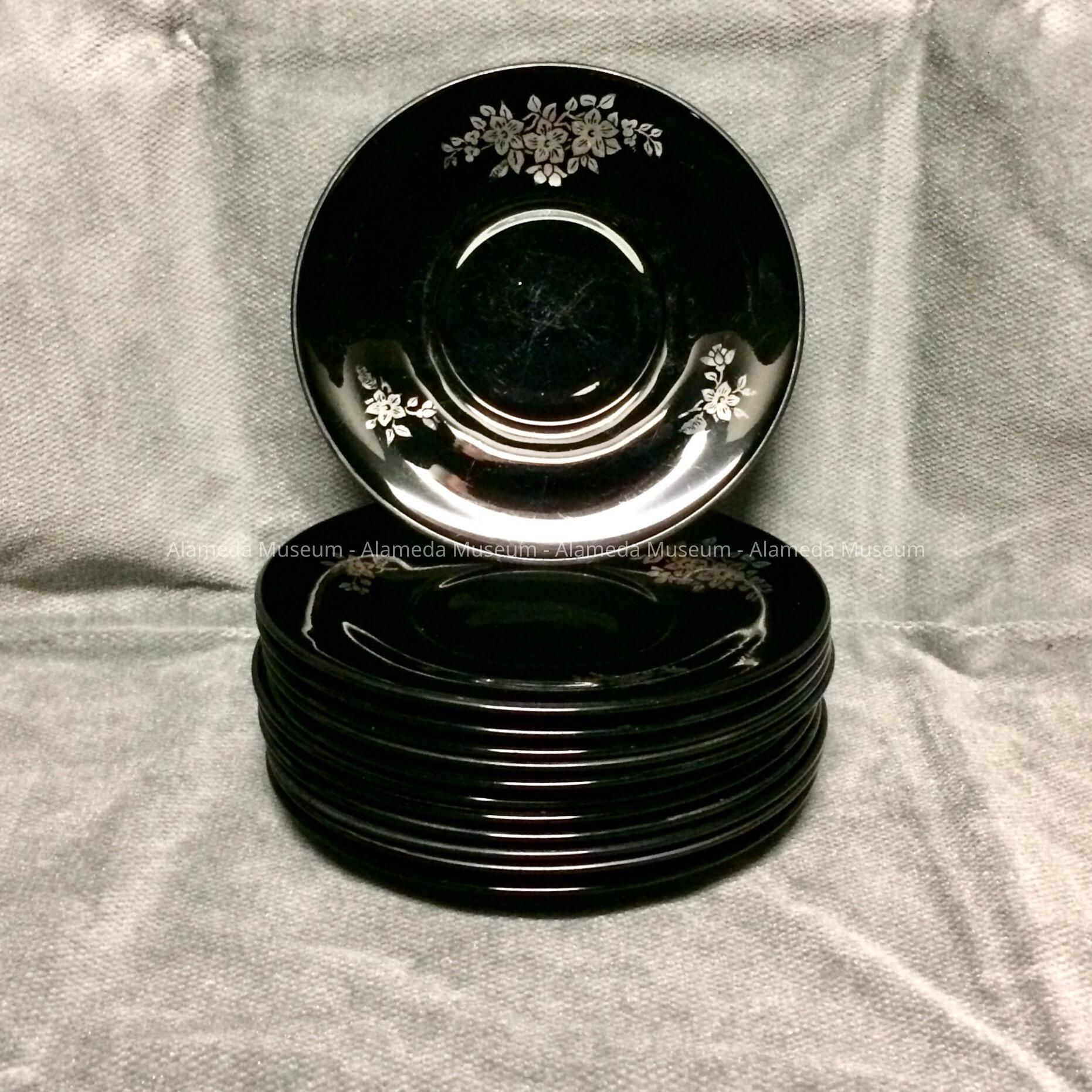 Description: A set of twelve luncheon plates in black colored depression glass that has been decorated with sterling silver paint; American made.