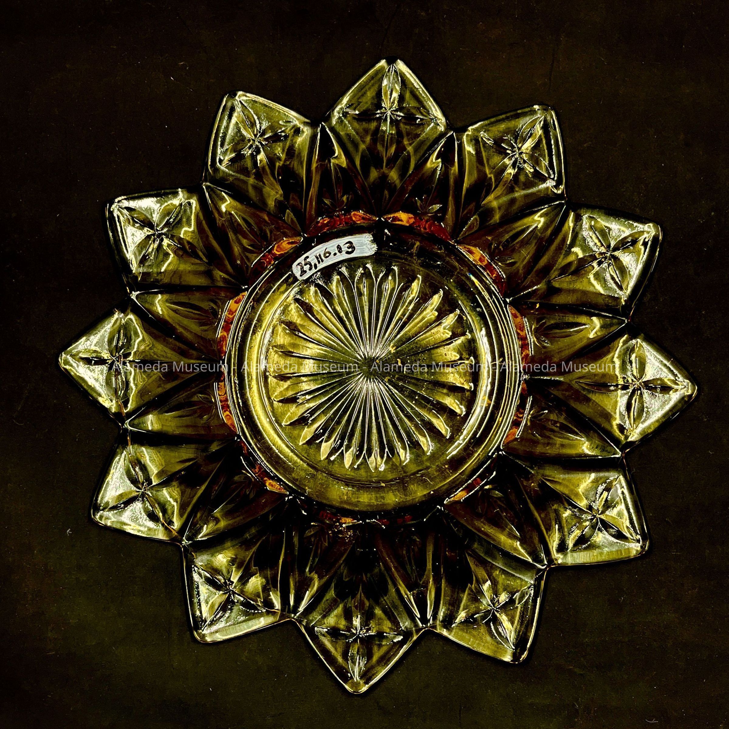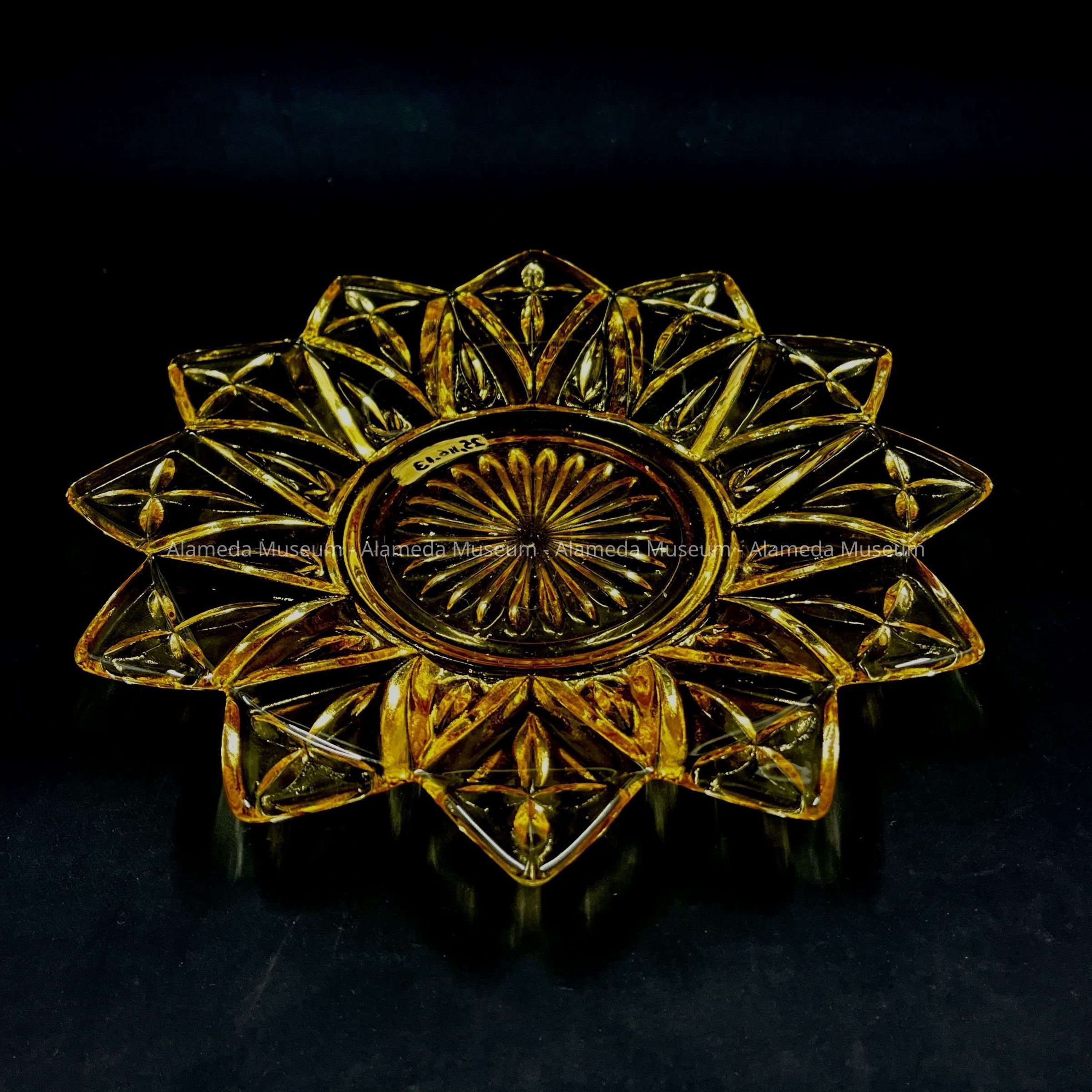 Description: an amber pressed glass serving dish, shaped like a sun or flower, with design simulating cut-glass. No seams visible.