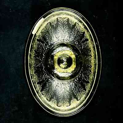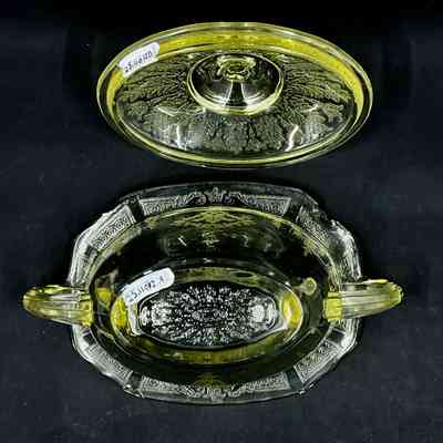 Description: An oval, pale amber pressed glass serving bowl with two handles and lid with knob, with pressed-in floral designs.