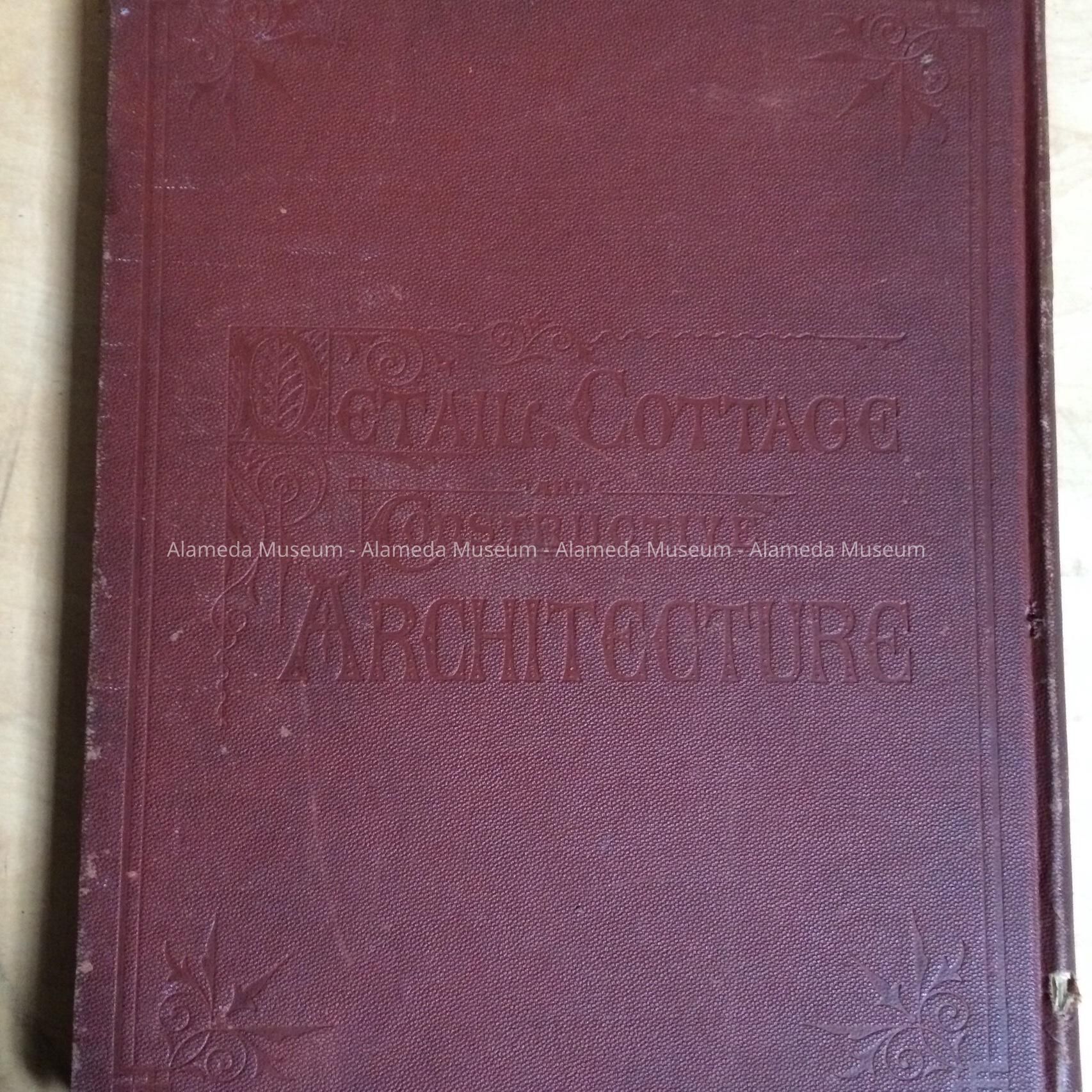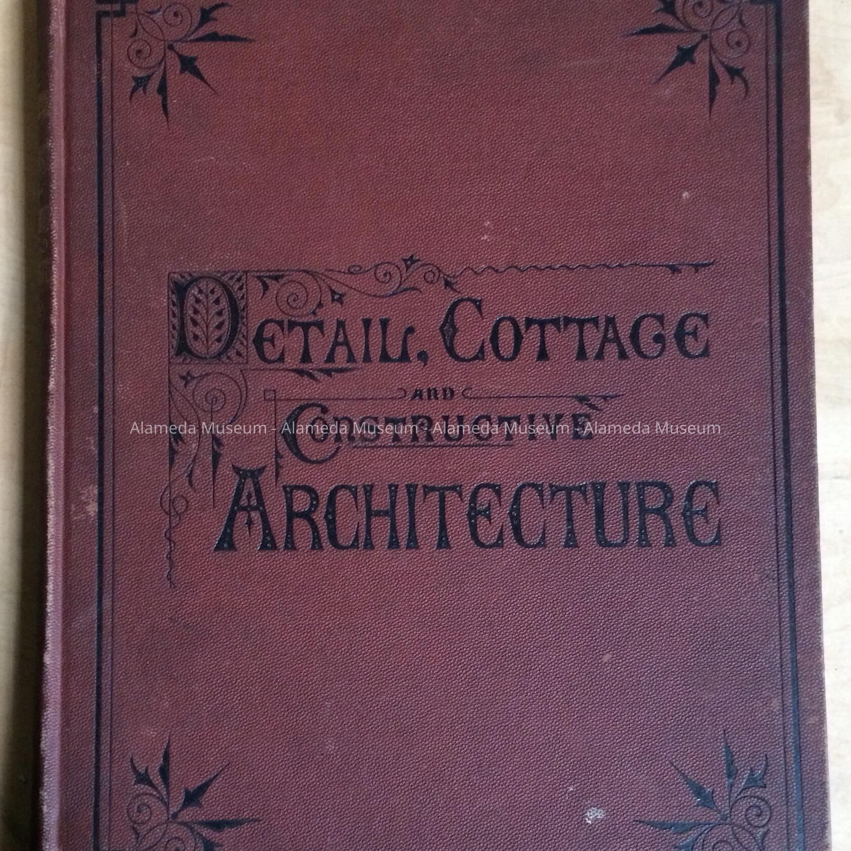 Hard bound book with reddish brown colored buckram covered cover, incised black lettering stating title "Detail, Cottage and Constructive Architecture."