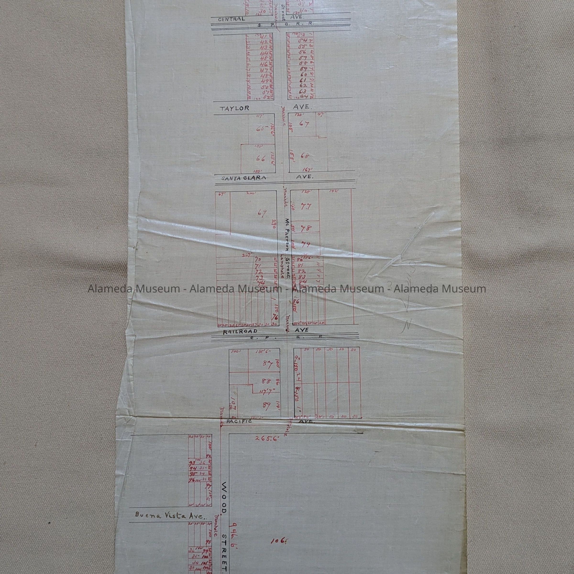 Description: A Plan, hand-drawn on off-white linen paper, with blocks marked in black ink and with property, sewer lines, manholes and lampholes in red ink. Title: ‘Diagram Mc Pherson St. sewer line, manholes and lampholes’. In pencil, ‘A 11’.